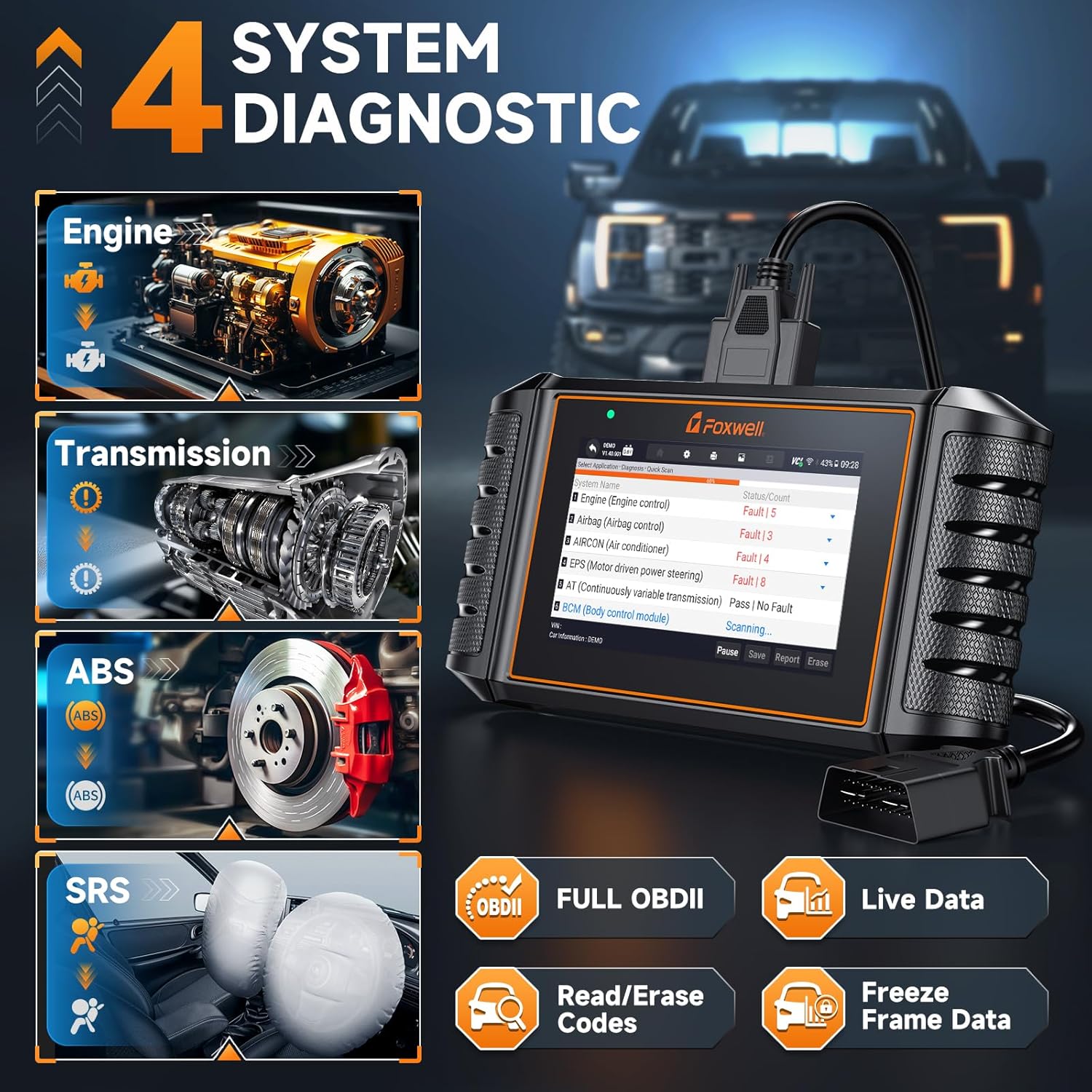 - 4-System Car Diagnostic Scanner for ABS, Airbag, Transmission & Engine – Effortlessly read and clear error codes, access ECU information, view 4-in-1 live data streams, and save or download data for analysis. The built-in DTC library provides clear explanations of fault codes, and once the issues are fixed, you can clear the codes and turn off warning lights with just one tap. The FOXWELL NT716 code reader scanner empowers you to handle most vehicle diagnostics on your own—saving you time and money without depending on a hard-to-find mechanic.