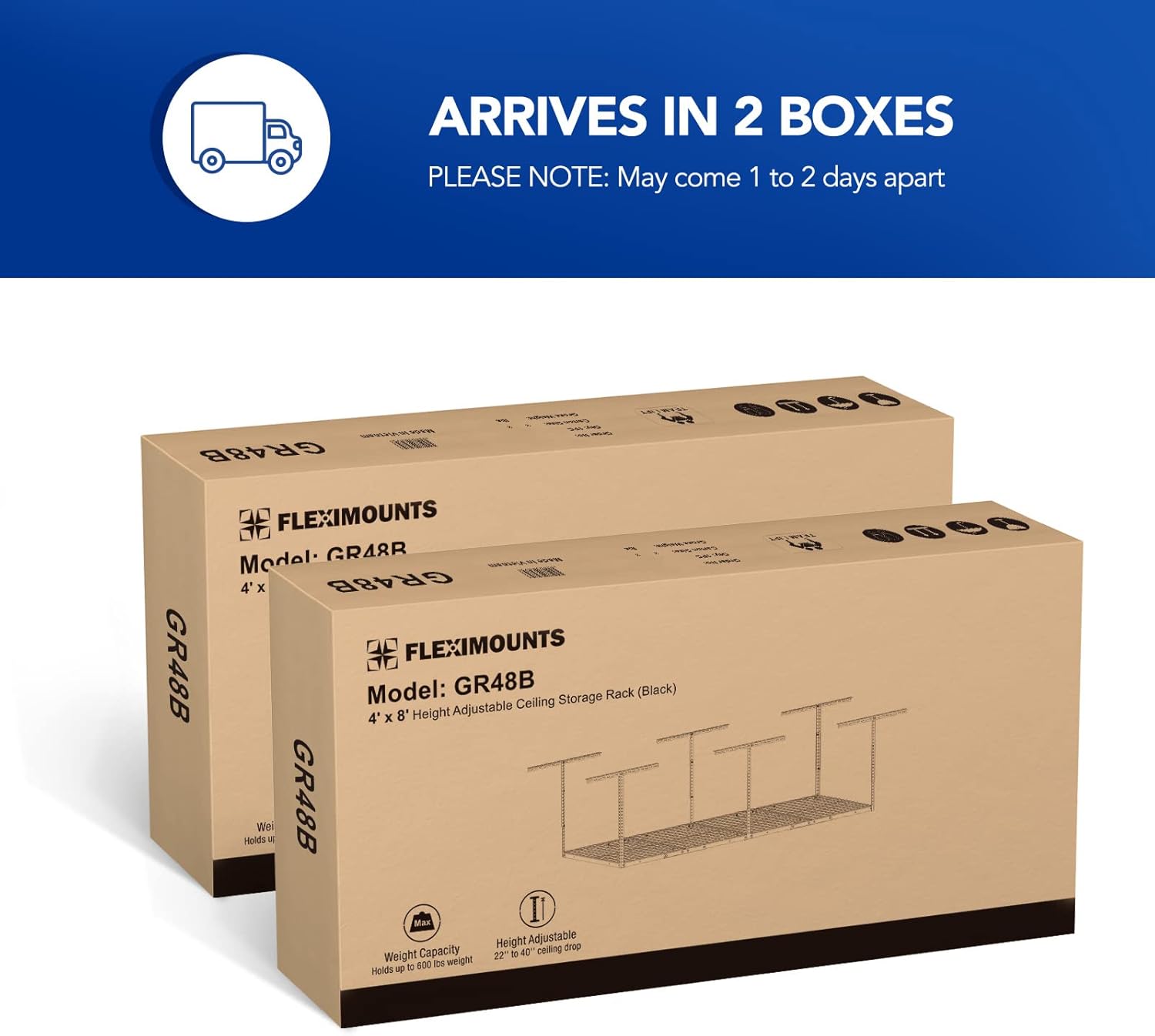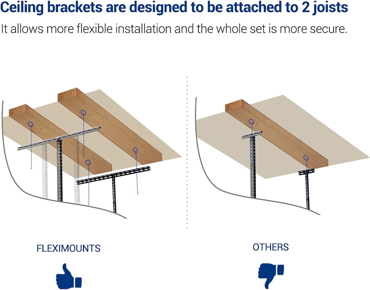 - STABILITY & SAFETY-With our specially designed longer ceiling brackets that attach to two joists, FLEXIMOUNTS overhead garage storage racks are more stable and secure compared to others!
