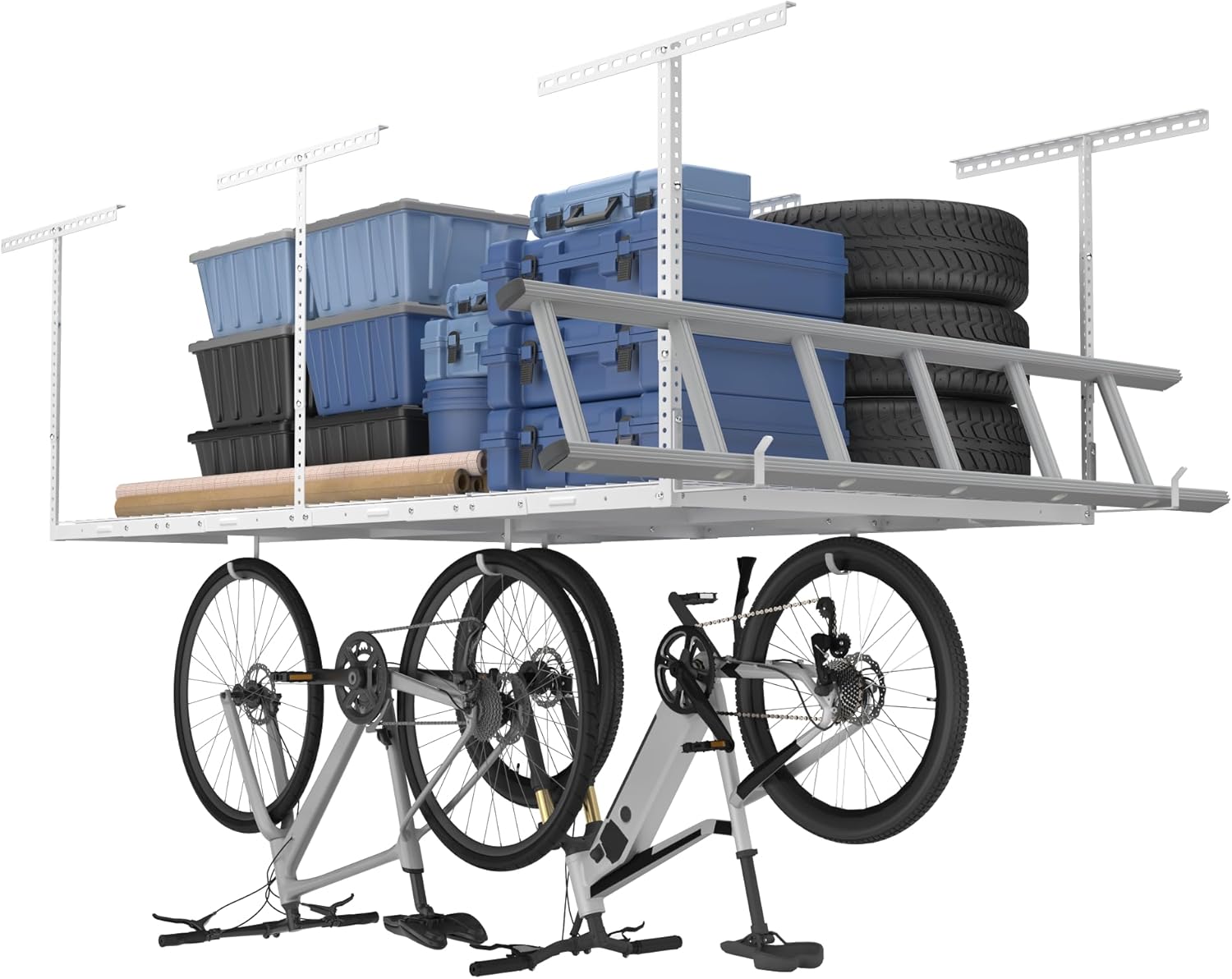 - WHAT YOU GET: 1 pc 4' x 8' Overhead Garage Storage + 4 pcs Flat Hooks + 2 pcs Utility Hooks.