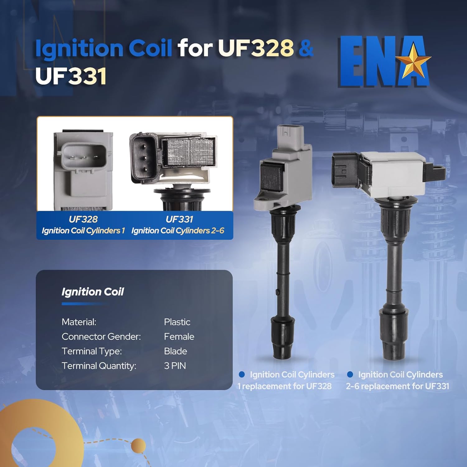 - Reference Number: Ignition coils Cylinders 1 replacement for UF328 UF-328 224484W000 224484W001. Coil Pack Cylinders 2-6 replacement for UF331 UF-331 224484W010 224484W011 UF331T. ENA Ignition Coils Features: plug-and-play design that allows for easy installation and are compatible with popular vehicles such as 2000 2001 Pathfinder QX4 V6 3.3L 3.5L