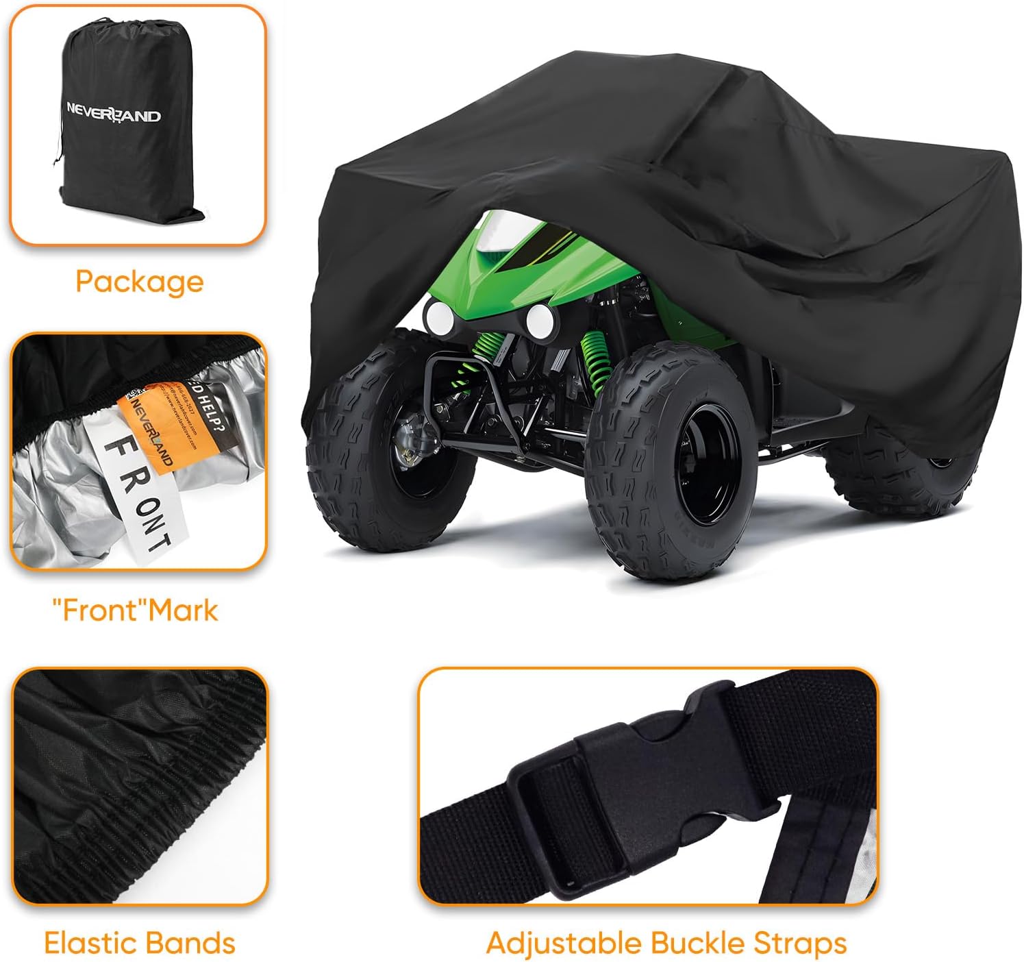 - ăELASTIC DESIGNăOur quad cover with elastic base wraps around tires can provide a good fit to your quad, do not worry about wind blowing away the cover; Protect your powersports vehicle's surface from being scratched by sharp objects