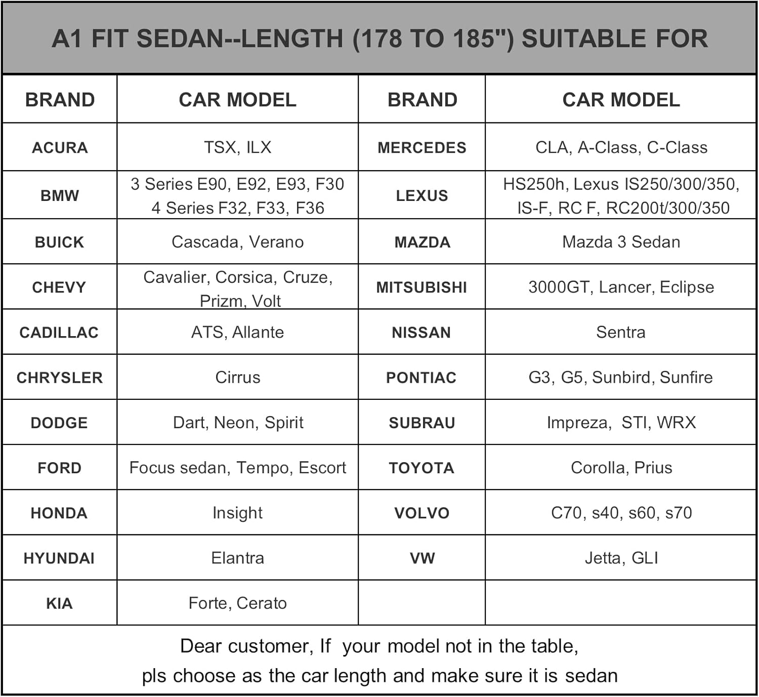 - ăDimension A1ăUniversal fit for sedan which length is 178 to185 inch (NOT FOR HATCHBACK AND SUV ). Suitable for Toyota Corolla/ Prius, BMW 3/4 Series, Ford focus sedan,Hyundai elantra, Kia forte/cerato, Lexus is250/300/350, Mitsubishi lancer/Eclipse/3000, Nissan Sentra, Subaru impreza/wrx, vw Jetta etc.