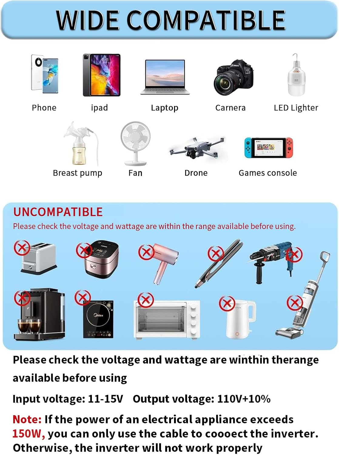 • [Multiple Protection Features] Safety is our top priority. The inverter is designed with multiple protection features, including overload shutdown, over-temperature shutdown, low voltage alarm, low voltage shutdown, high battery voltage shutdown, short circuit protection, and polarity reverse connection protection. Your devices and car battery are well-protected.