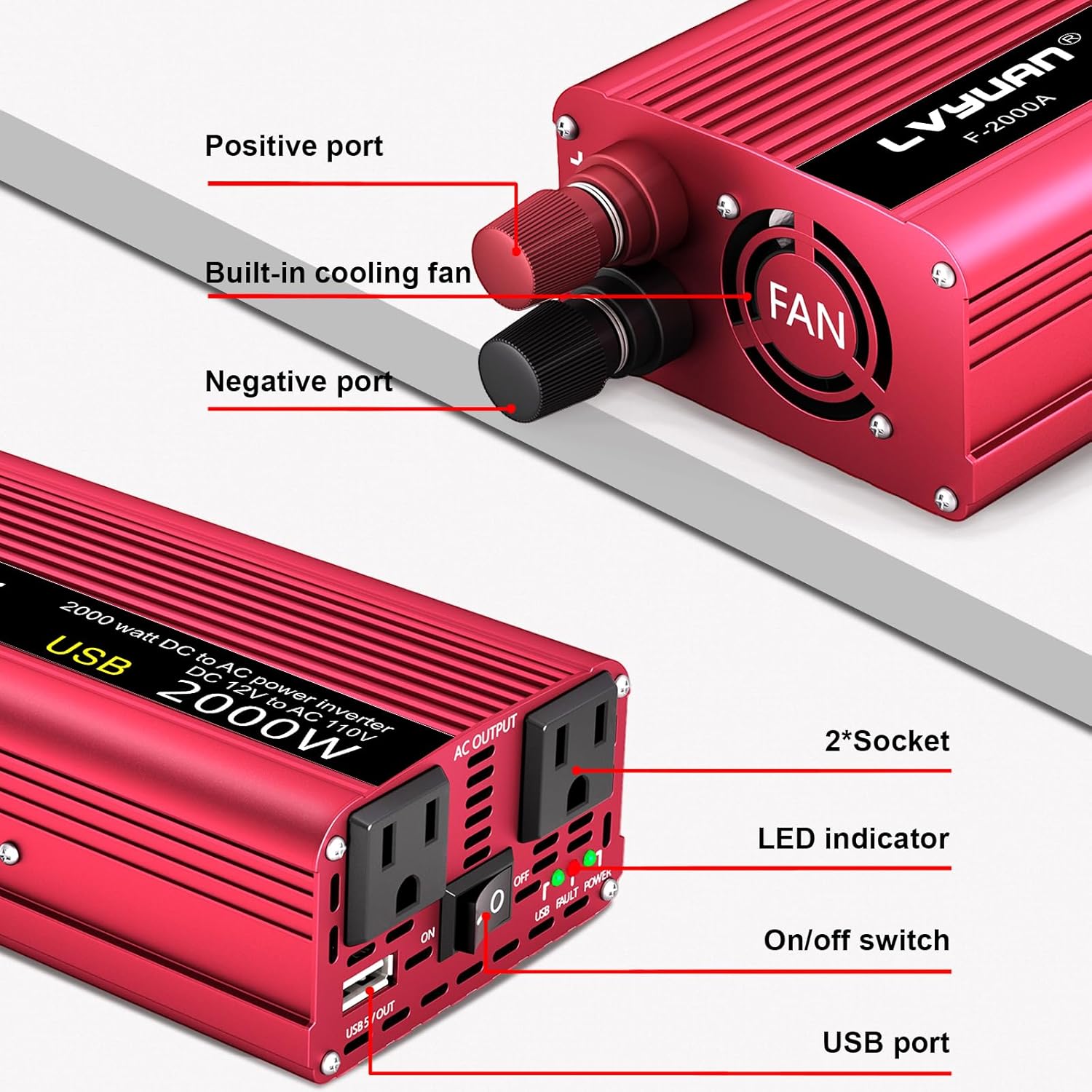 • [Highly Powerful Inverter] The power inverter delivers a continuous DC 12V to 110V/120V AC power, providing 1000 watts of continuous power and 2000 watts of peak power.