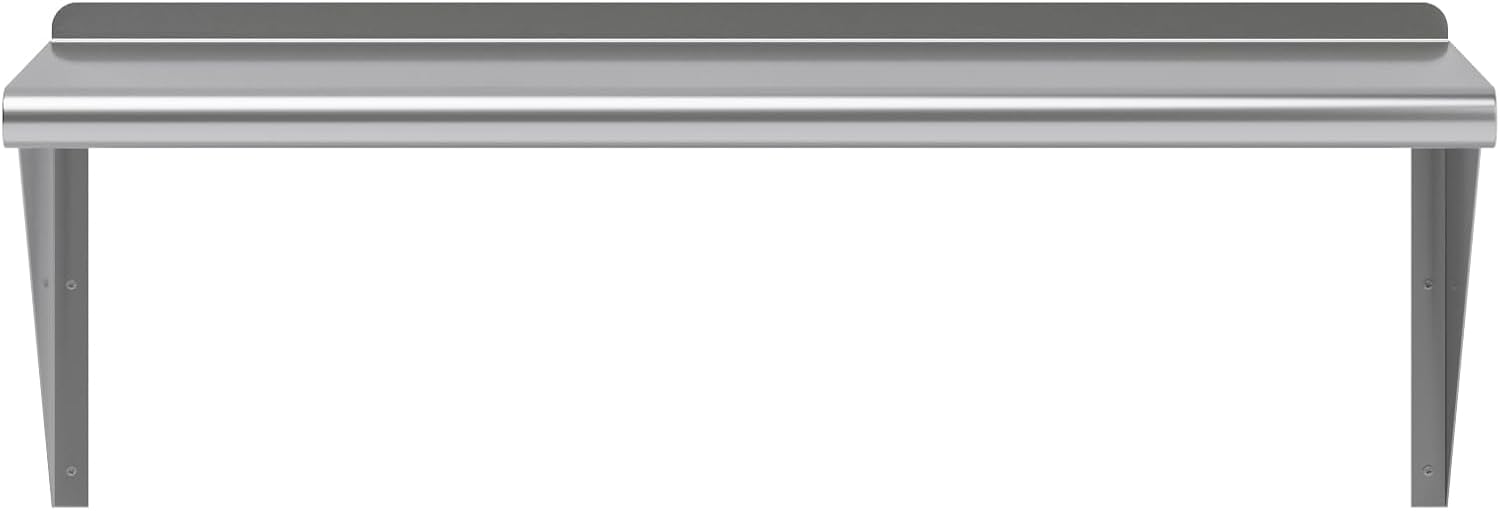 - This heavy-duty multifunctional stainless wall shelf is made with 18 gauge stainless steel and can hold up to 270 lbs of weight. The design features a 1" backsplash and bullnose edge. It's made with durable welded corners and support brackets.
