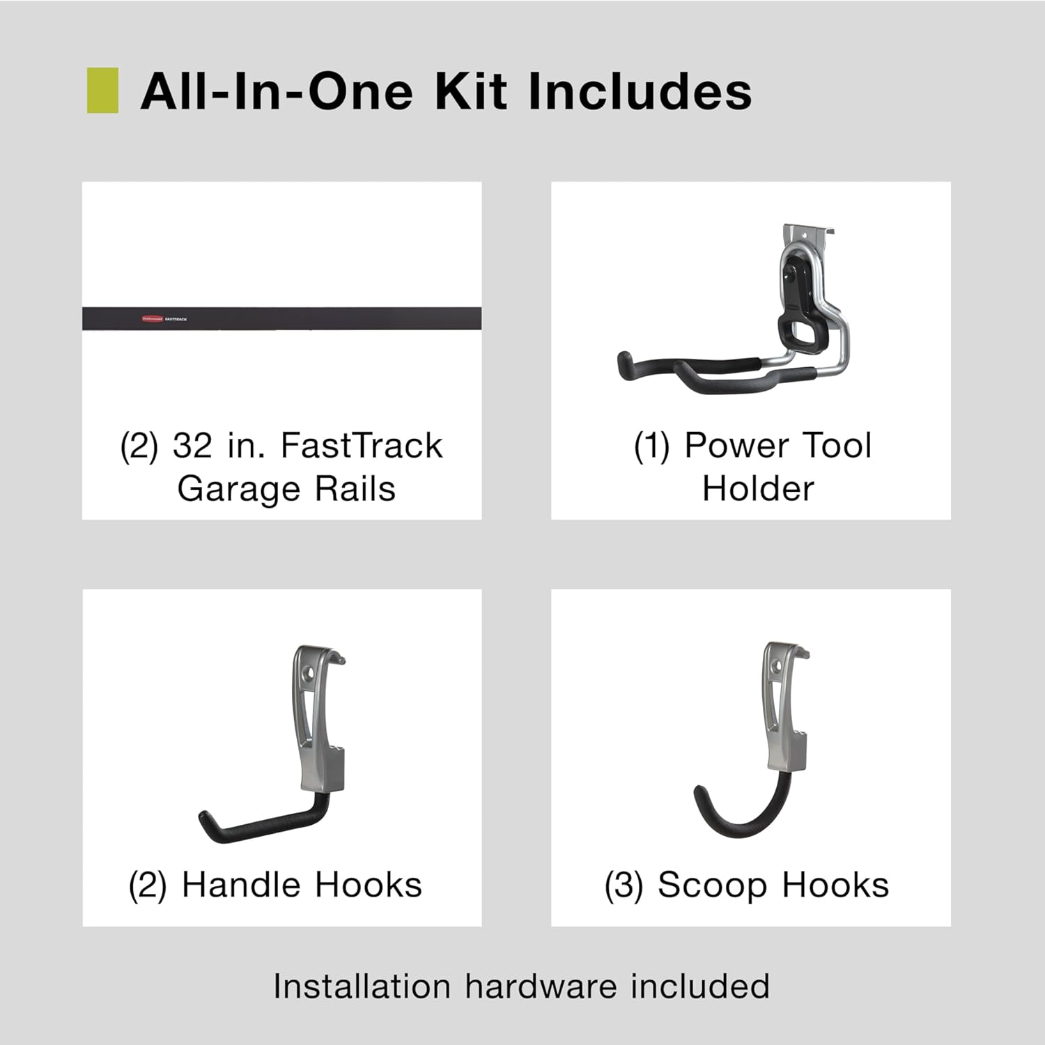 - KIT CONTENT INCLUDES: (2) 32" Rails (2) Handle Hooks (3) Scoop Hooks (1) Power Tool Holder