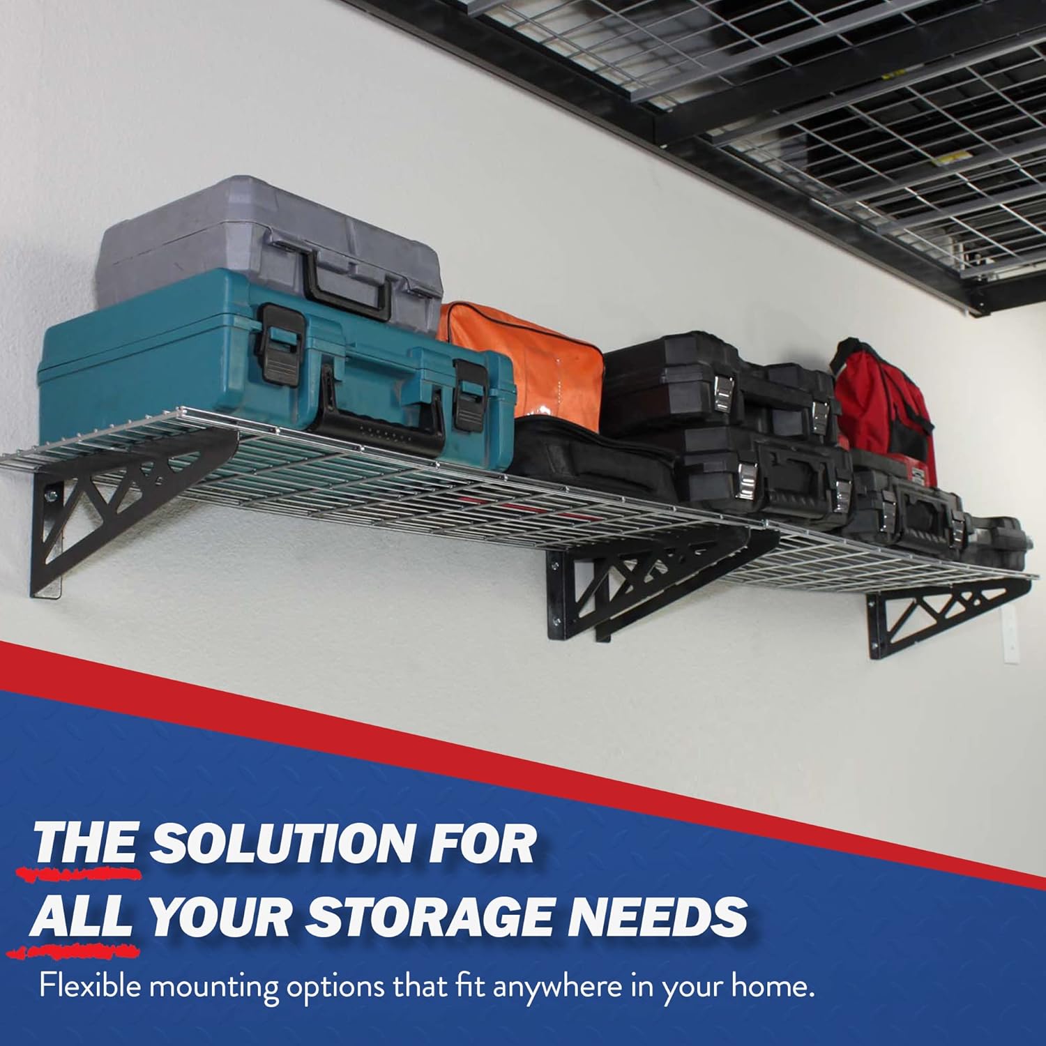 - HEAVY DUTY SHELVING RACK: Our utility shelves for storage use case-hardened 5/16”x2.5” lag bolts and can withstand the weight of almost anything you can find laying around your garage. Each utility shelf has a capacity of 150 lbs and can withstand heavy materials like construction tools, sports equipment, or storage bins.