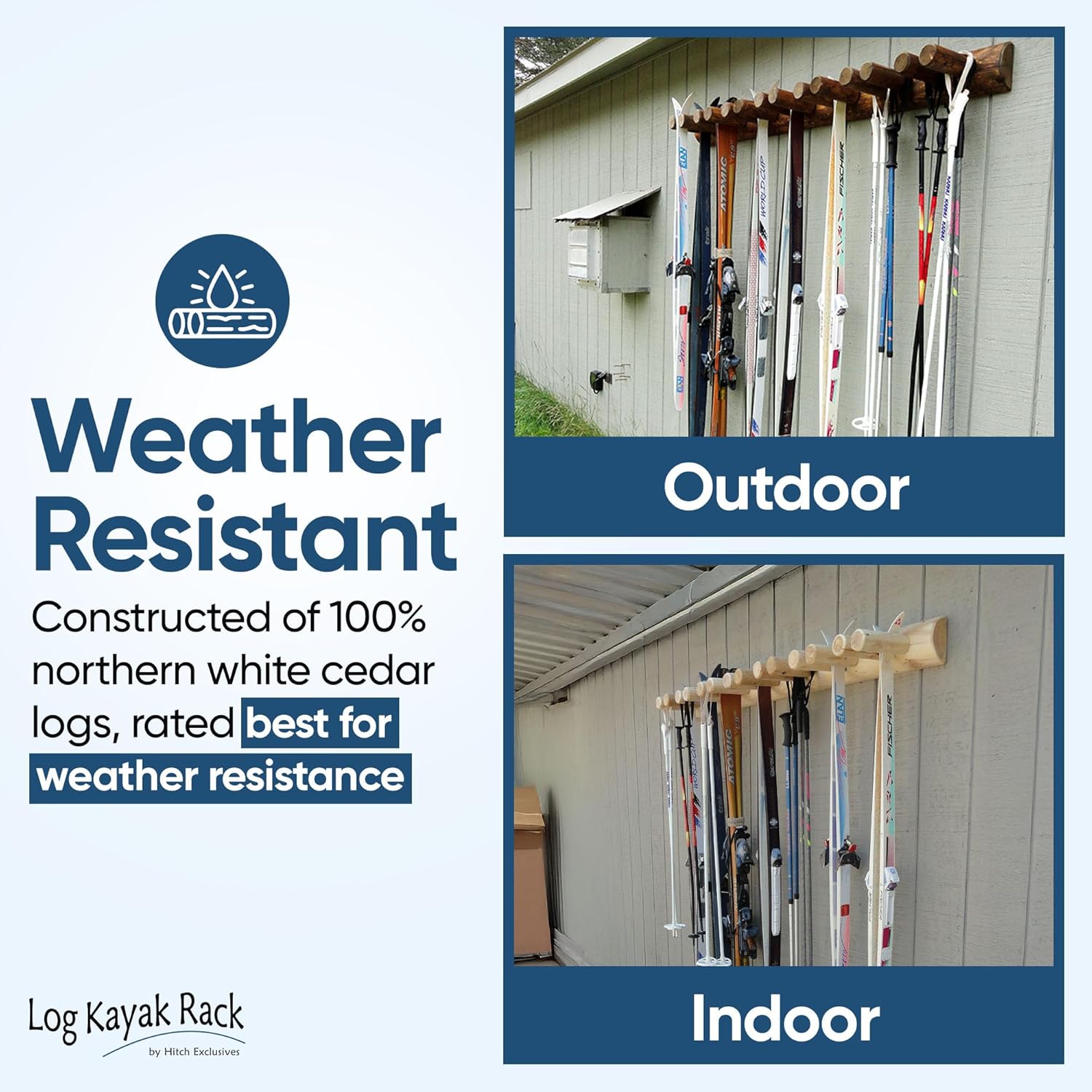 - CONSTRUCTED WITH DECAY-RESISTANT NORTHERN WHITE CEDAR LOGS - Built from the finest Northern White Cedar, this ski rack garage storage solution is designed to withstand harsh conditions, both indoors and out. The decay-resistant wood ensures that your garage ski rack wall mount remains strong and reliable for years to come. Whether in your garage, shed, or cabin, this durable ski holder wall mount offers a stable and attractive option for ski gear storage that stands up to the elements.
