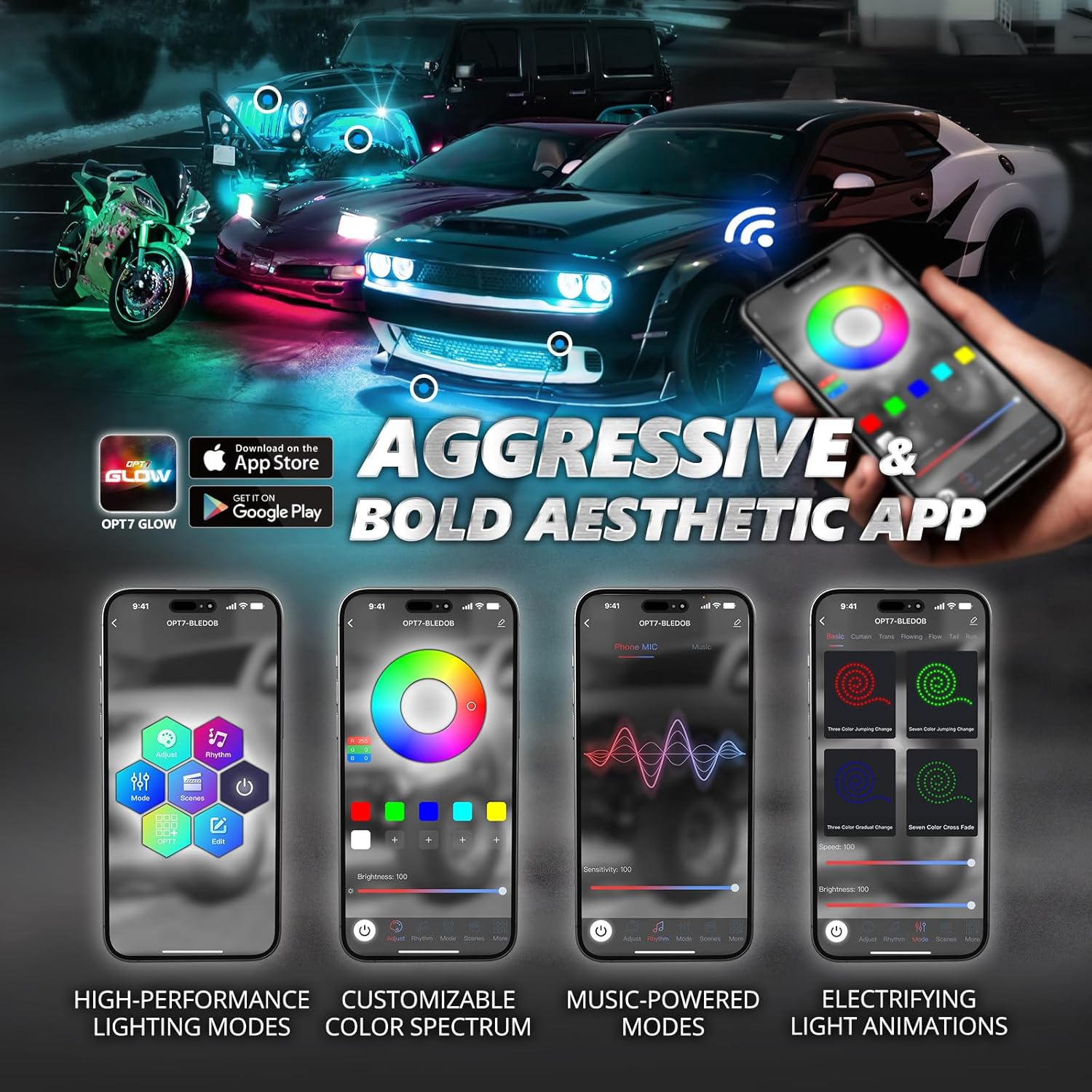 - Effortless Dual Control: Adjust your grille lights in seconds with the remote, choosing from 12 bold colors, 24 exciting modes, and 10 speed and brightness levels. Looking for more effects? The Bluetooth OPT7 GLOW App unlocks endless lighting modes and music sync, letting your rims pulse to the beat for a remarkable ride. Whether cruising or showing off, set the ultimate vibe with ease!
