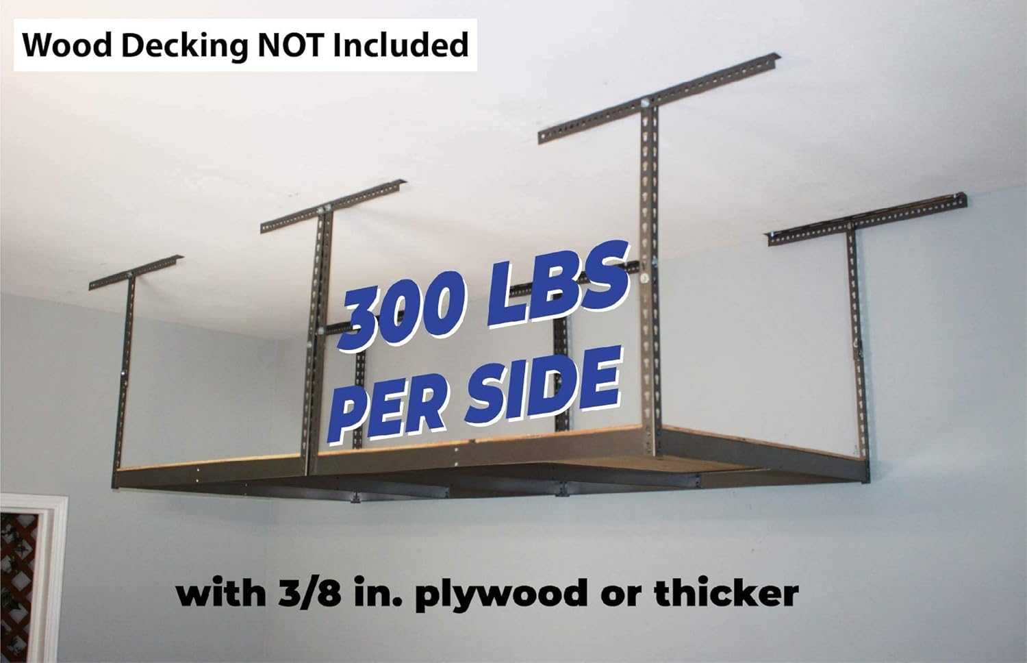 - INDUSTRIAL-GRADE STRENGTH: This overhead garage storage frame is made out of industrial grade steel to make sure of its durability and strength. This ceiling storage organizer is composed of TWO separate 4" x 4" Overhead Racks that equate to the standard 4" x 8" when installed side-by-side. When used with a 3/8" Plywood deck, each 4 x4 can hold up to 250 lbs., for a total of 500 lbs. capacity.