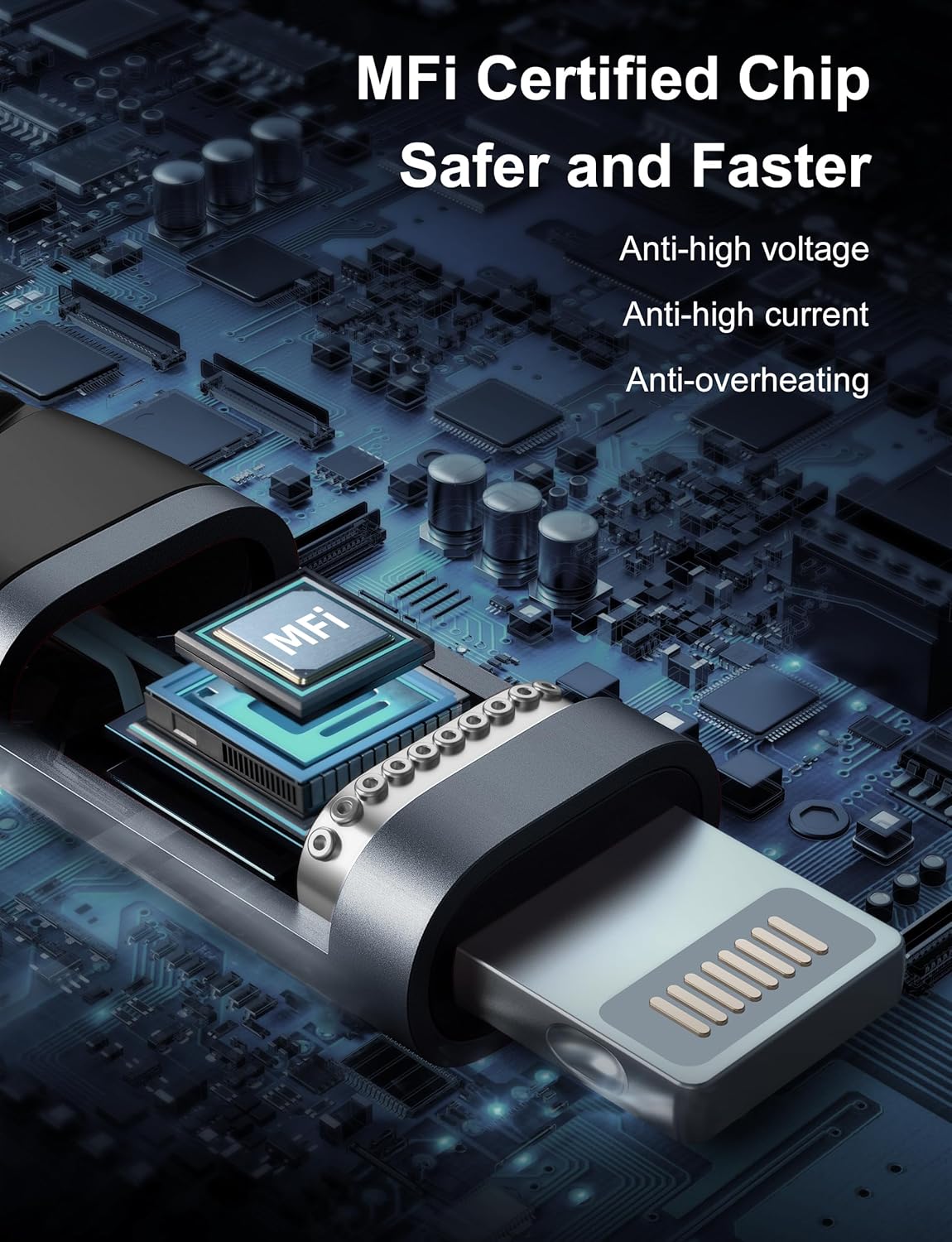 - ăApple MFi CertifiedăUSB C lightning cable built in MFi certified chip, work flawlessly with any Lightning device. iPhone fast charger cord uses the newest C94 lightning connector and boast anti-high voltage, anti-high current and anti-overheating design, can safely and quickly charge your iPhone or iPad.