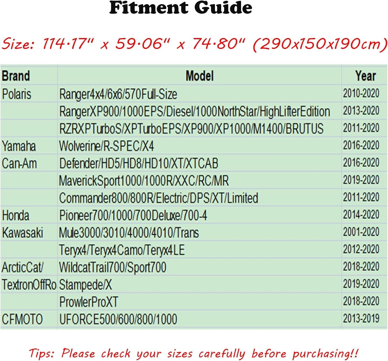 - [Check Your UTV Size]: Fit all 2-3 seater UTV's, 114.17"x 59.06"x 74.8". Our covers are compatible with polaris, rzr, ranger, canam, suzuki, honda, kawasaki, yamaha and more. If you not sure your vehicle fit or not, please let our customer service help you