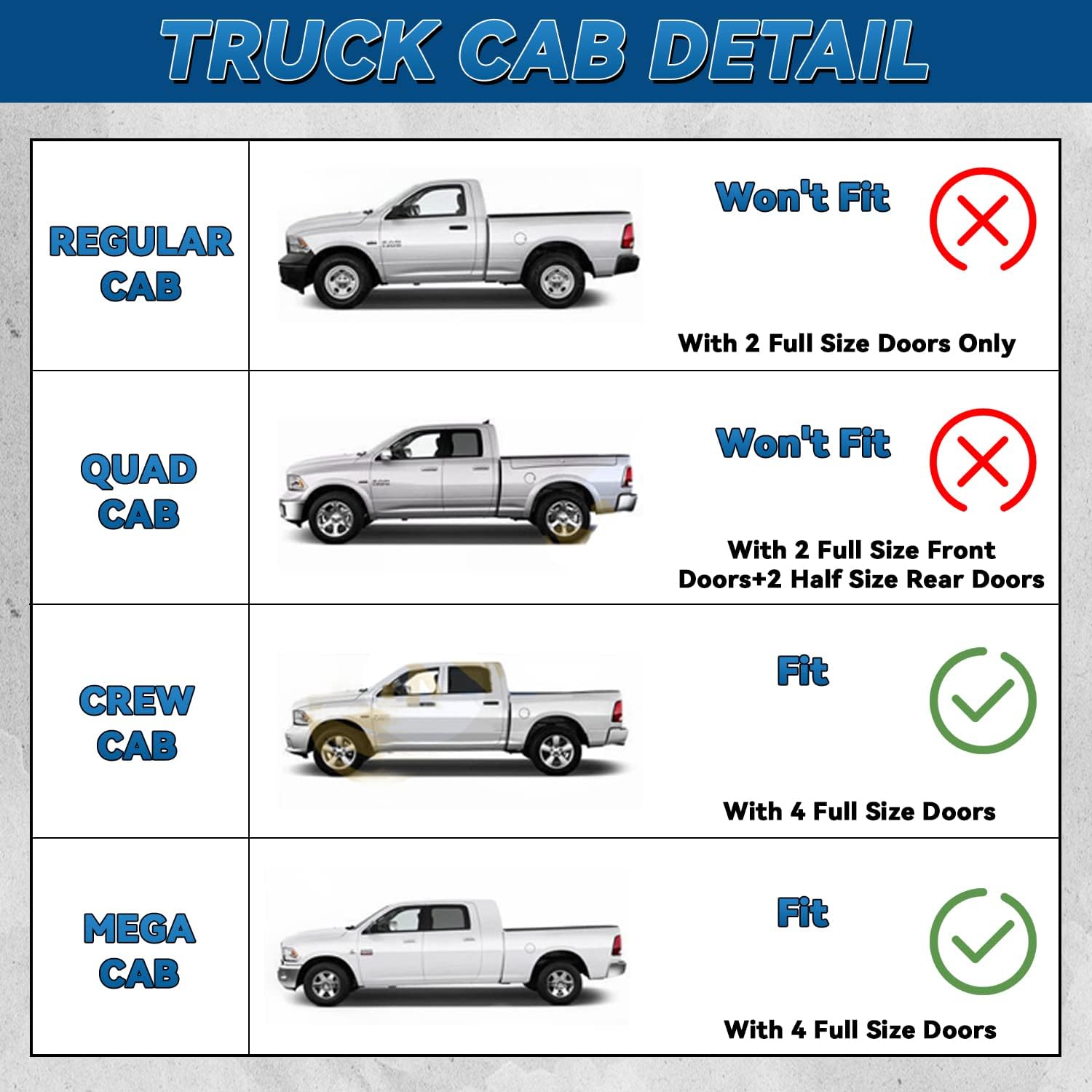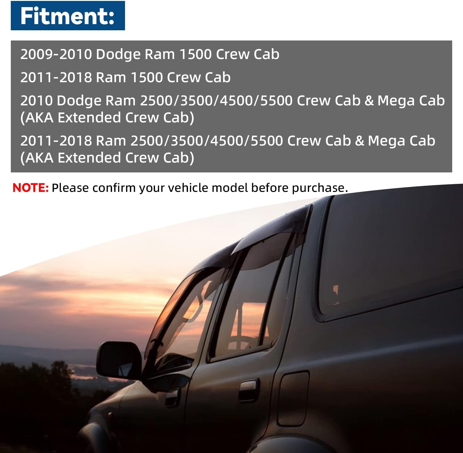 - Fit: 2009-2010 Dodge Ram 1500 Crew Cab; 2011-2018 Ram 1500 Crew Cab; 2010 Dodge Ram 2500/3500/4500/5500 Crew Cab & Mega Cab (AKA Extended Crew Cab); 2011-2018 Ram 2500/3500/4500/5500 Crew Cab & Mega Cab (AKA Extended Crew Cab)