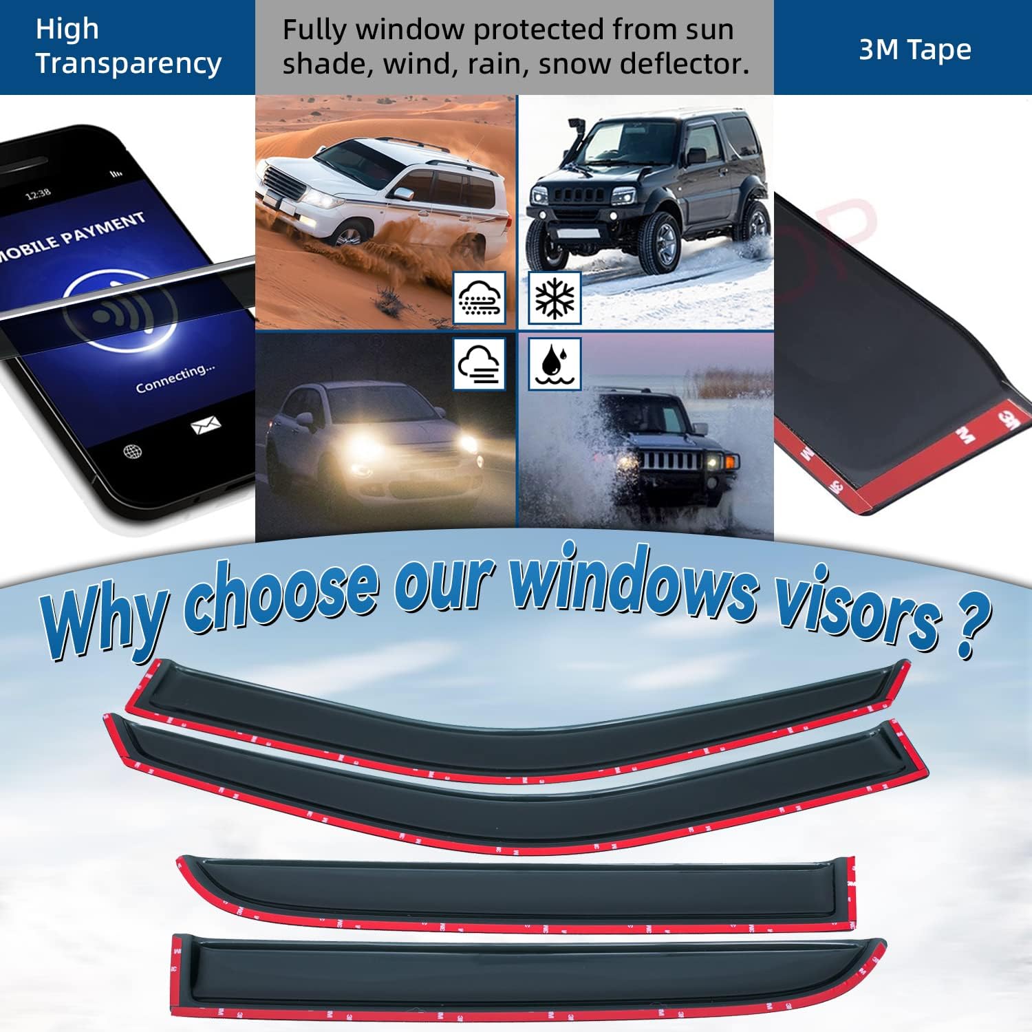 - Package Included: 4pcs front + rear vent window visors (3M Tape Included)