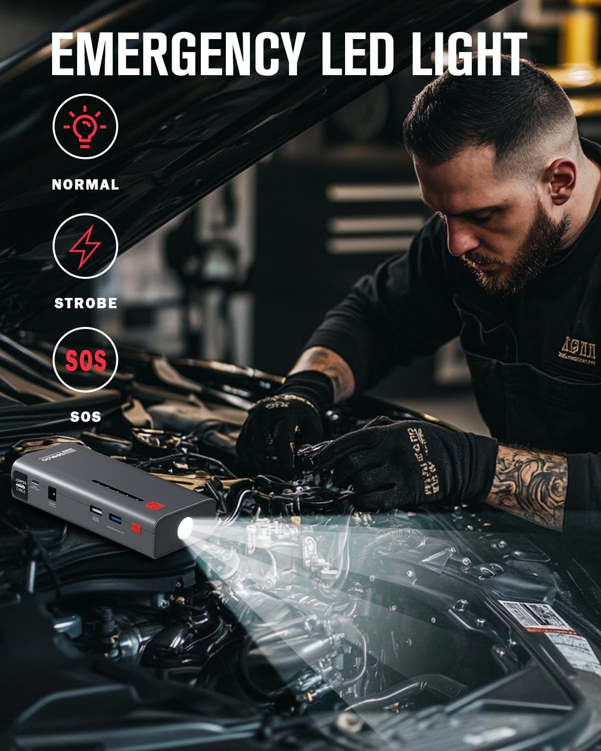 - LED WORK LIGHT: Not only a 12v portable car battery charger jump starter, the super bright LED work light has 3 modes: Flash Light, Strobe Light and SOS Light. This multipurpose flashlight is great for camping, travel, power failures, emergencies, etc.