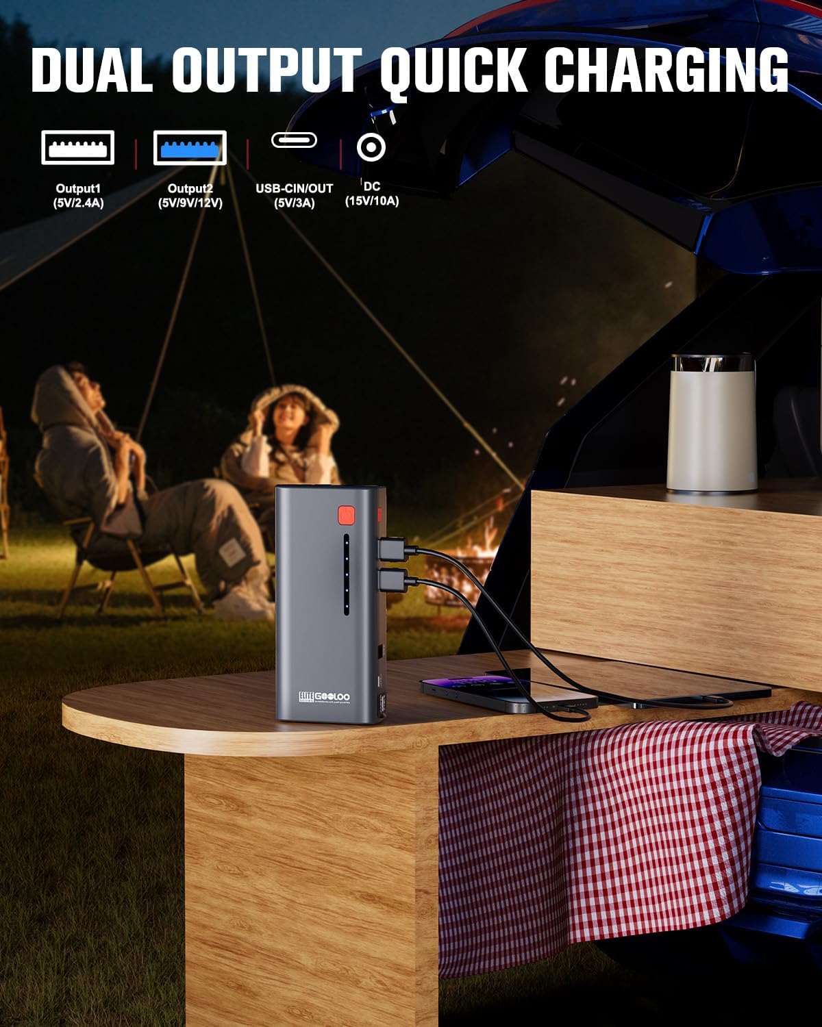 - POWER BANK CHARGER: The GOOLOO portable car battery jump starter box can be used to charge numerous devices using its USB output ports (5V 2.1A, 5V 2.4A/9V 2A) or 15V 10A output using the included cigarette lighter socket. The quick-charge 3.0 USB port charges your devices faster and is compatible with almost all USB charging devices, including cell phones, tablets, Kindles or digital cameras.