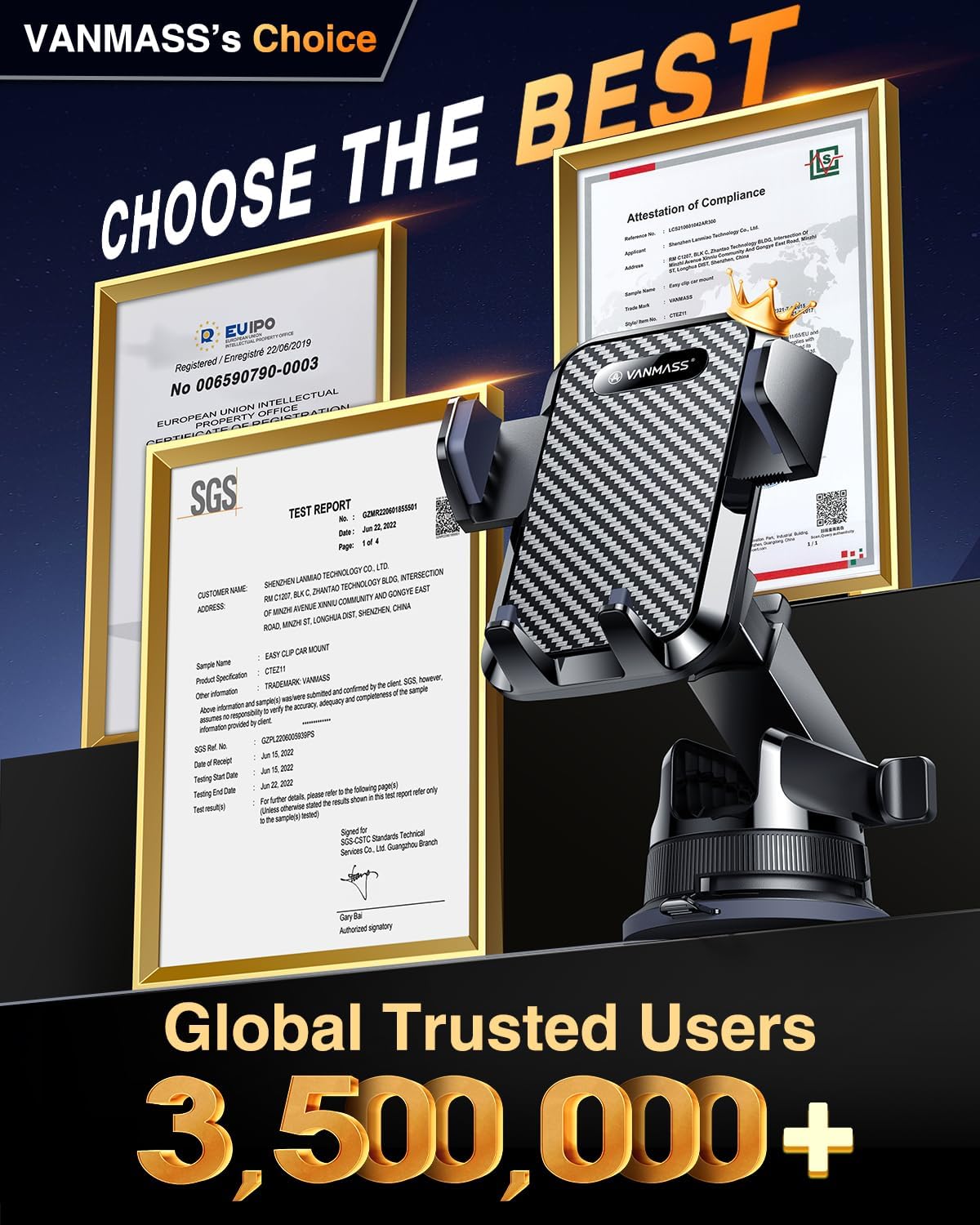 - ăBEST Newest Car Phone HolderăVANMASS's best car phone mount with the highest rating! Preferred by 3,500,000+ Customers; Designed by world-class professional team; enjoy EUIPO Patent (No.007708805-0001), Military-grade certificate (No. GZMR220601855501), CP65/REACH/ROHS; 4,000+ kinds of material selection, 500+ suction cup upgrade designs, and 20,000 miles of road tests; giving birth to the best combo of the Flagship&Classic hoolder with newest suction cup