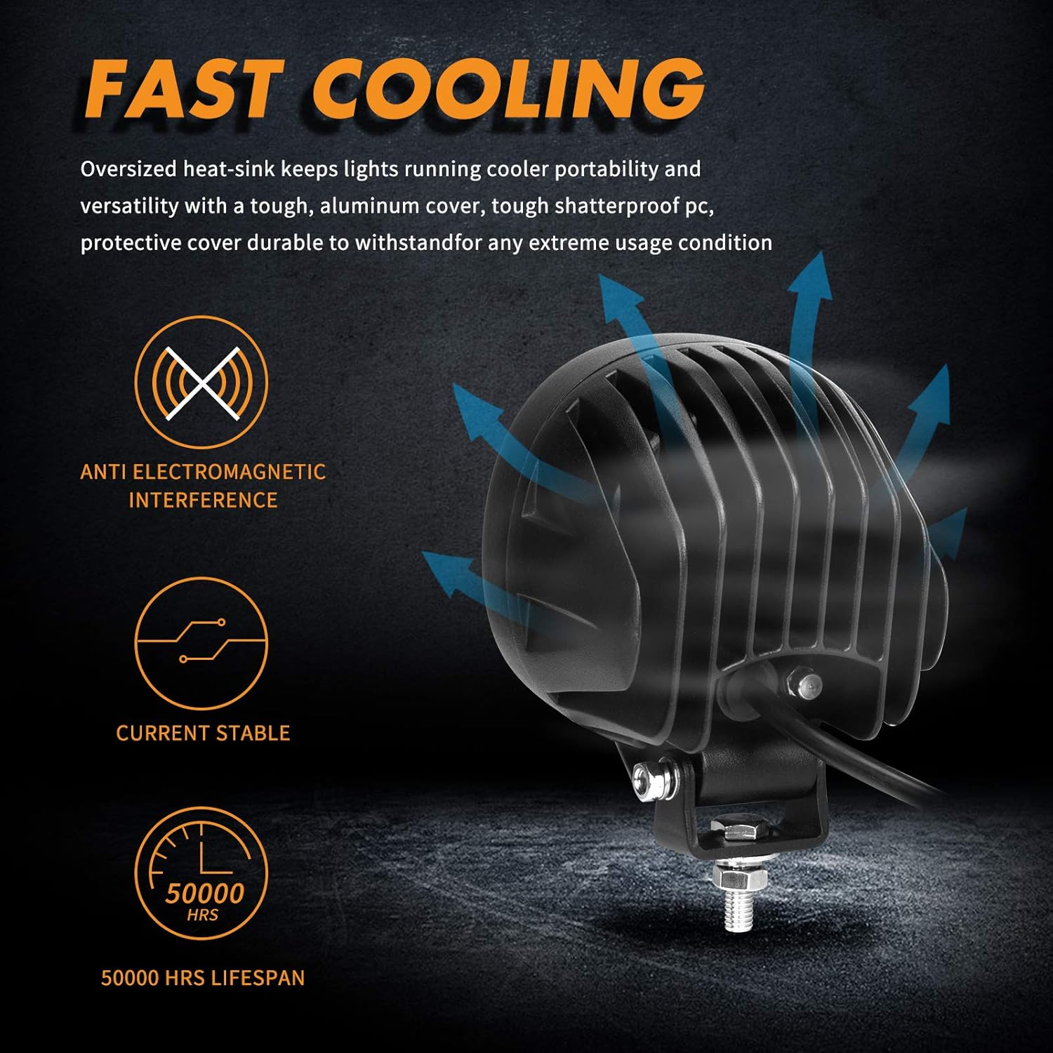 - INCREDIBLE BRIGHTNESS - 4 inch led flood lights under 9 pieces high efficiency LED chips and specially built optical reflector, which luminous flux of 300% increased, 3500K amber color temperature with 60° broad beam pattern light up the night and blind spots on the road.