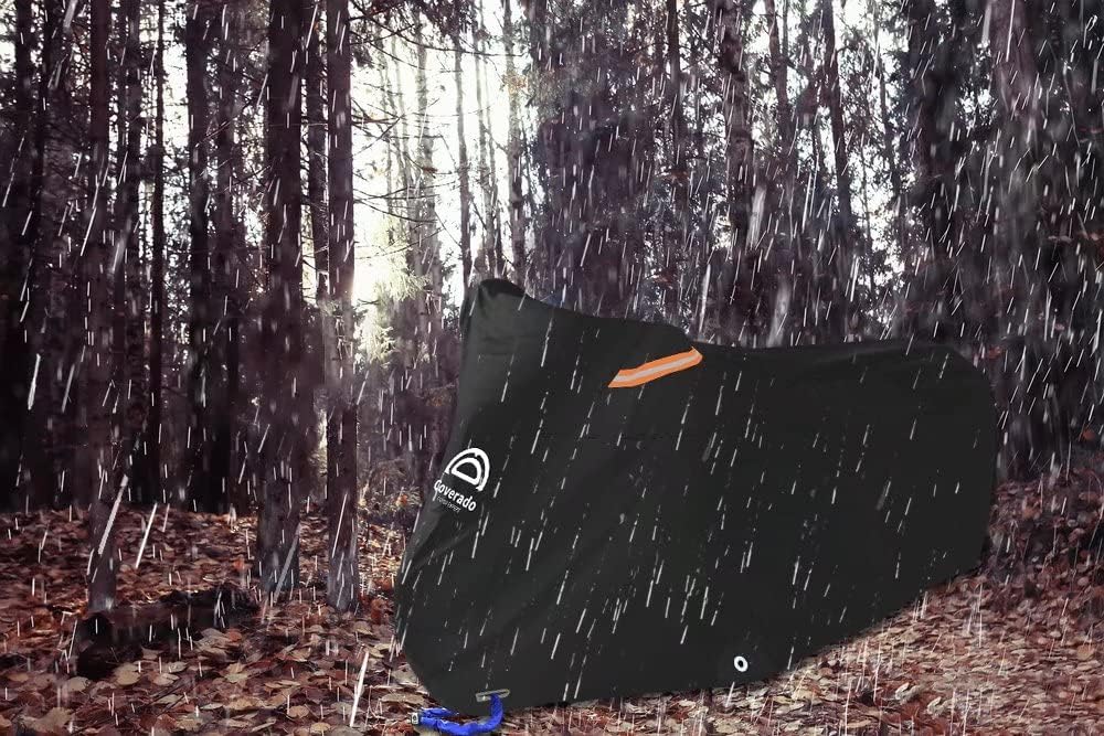 - Perfect Design: 1. with 2 anti-theft woven lock holes at front, security anti-theft. 2. windproof elastic strap with S shape hooks in the middle to fix your motorcycle in heavy wind weather. 3. reflective stripes to clearly see the location of the vehicle in the evening and prevent collision. 4. breathable air vents to reduce moisture accumulation and allows for the circulation of air to keep the inside dry. 5. comes with a large enough storage bag, easy to carry.