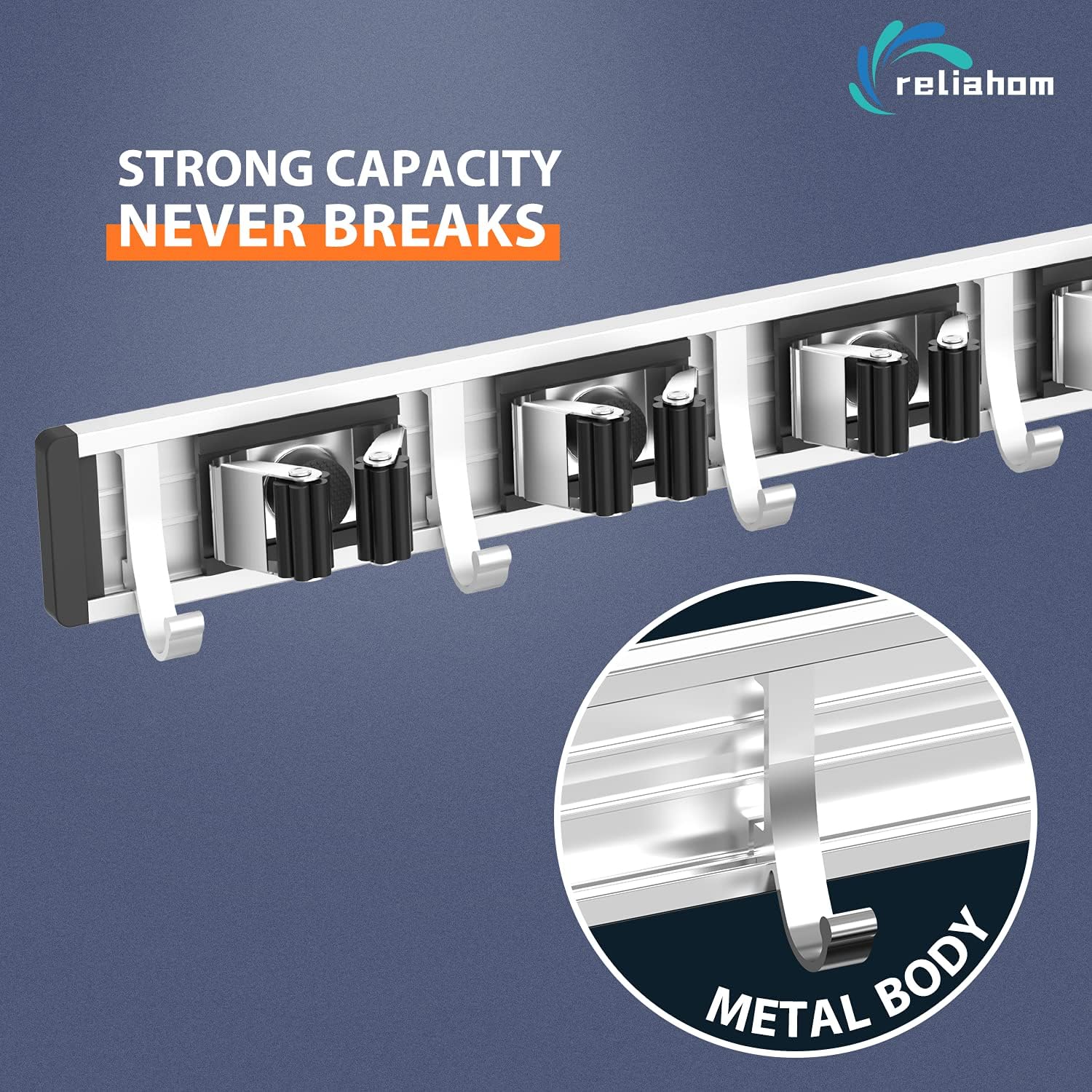 - Sturdy: Reliahom broom holder is made of metal base board, Stainless steel grip, metal Hooks. It is strong, waterproof, sturdy.