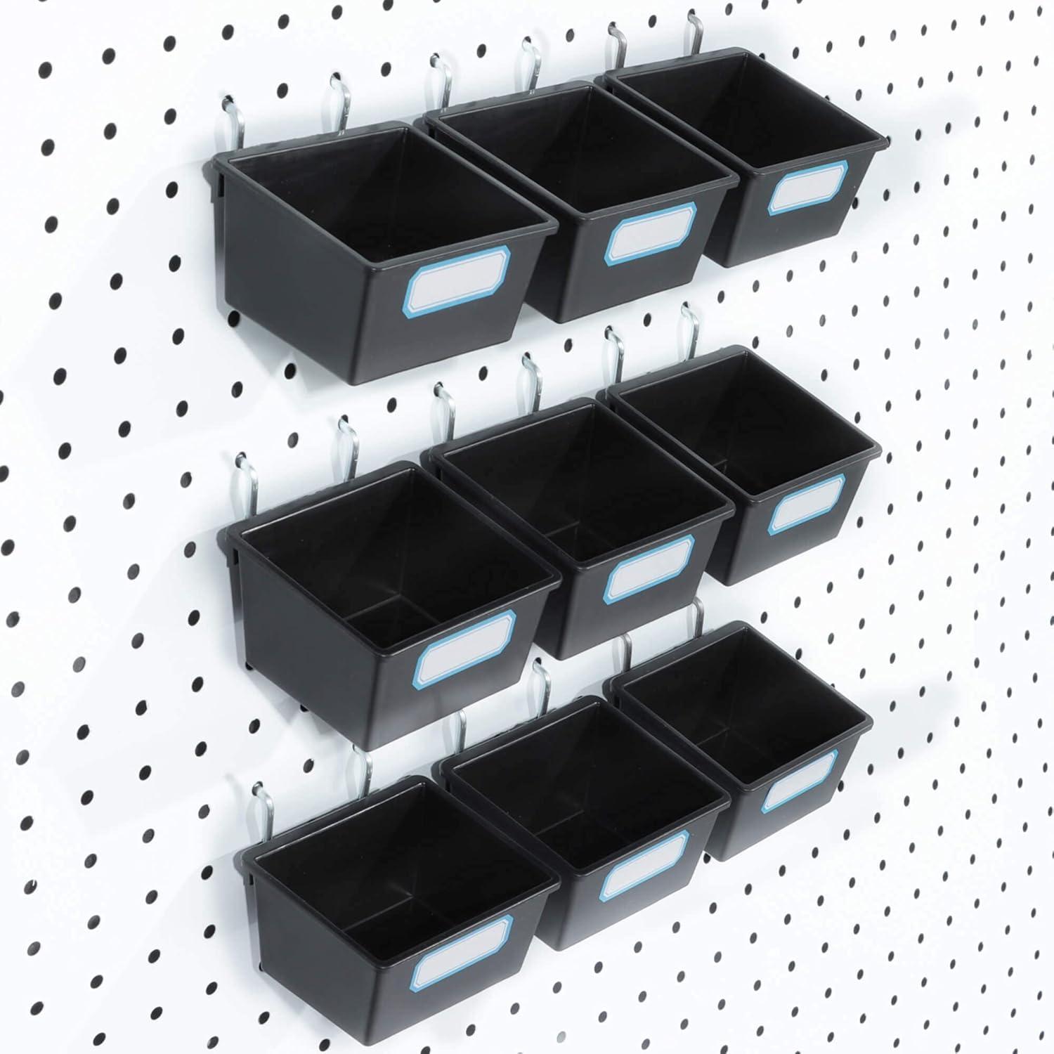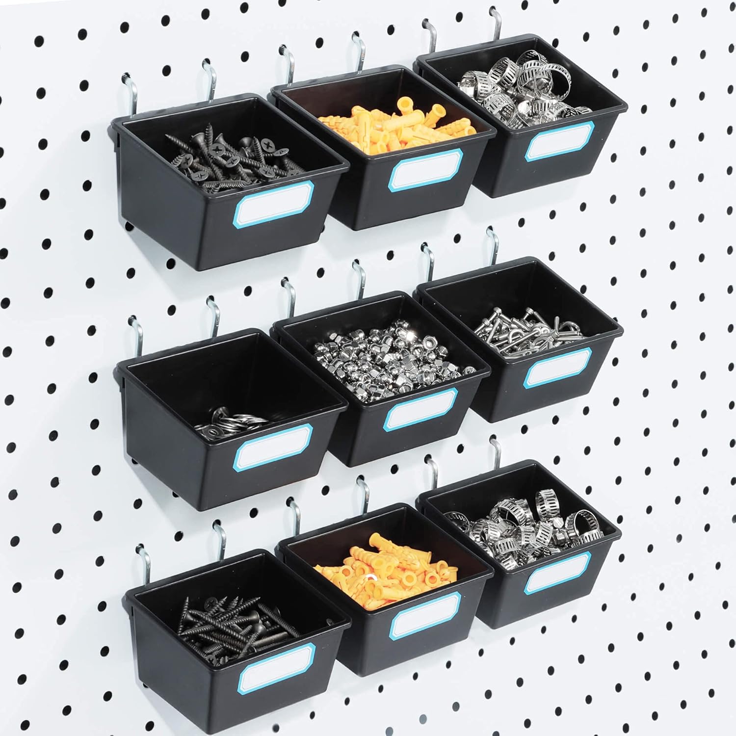 - 【Value Set】16 packs black 3.5*3.2*2 inch pegboard bins with metal hooks and labels.