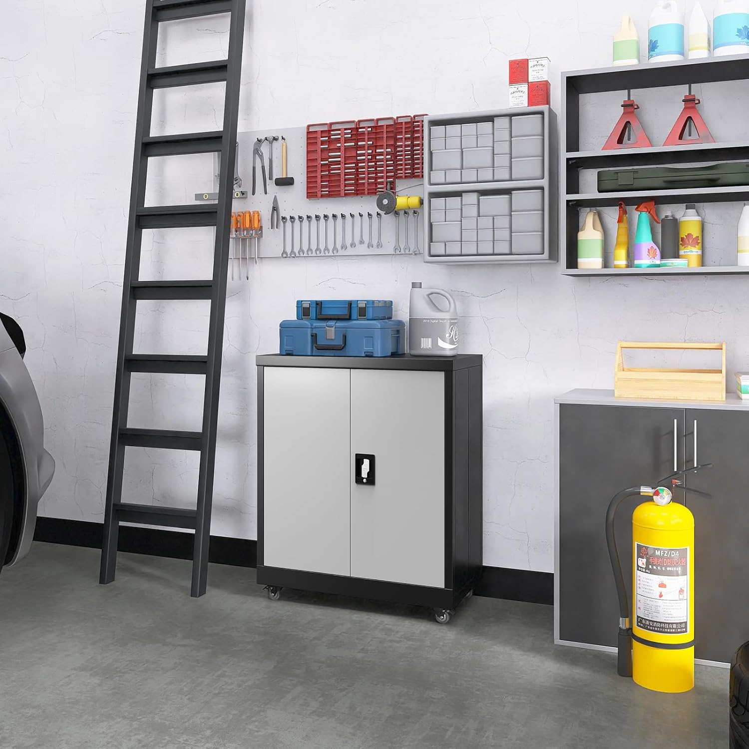 LUCYPAL Metal Storage Cabinet with 2 Doors,Steel Storage Cabinet with Adjustable Shelves and Wheels,Locking Tool Cabinets for Office,Home,Garage,Black&Grey 31.5" H