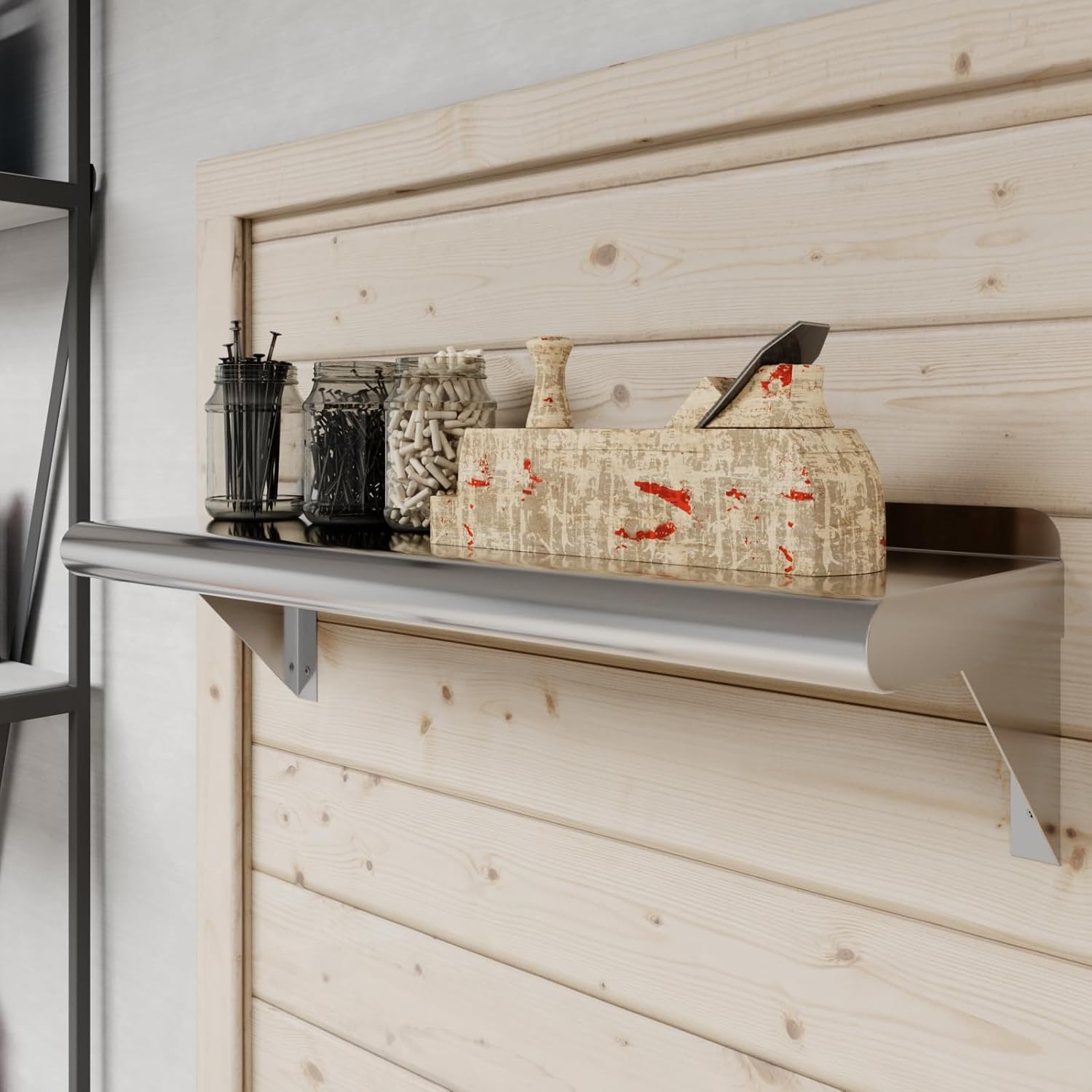 - This corrosion-resistant wall mount shelf can handle anything you throw at it and will last for years to come. Easy to clean and sterilize, metal shelves are superior to wood or glass. Food and liquid wonβt get stuck or ruin the integrity of the surface. Easily wipe away excess with no fuss, mess, or contamination.