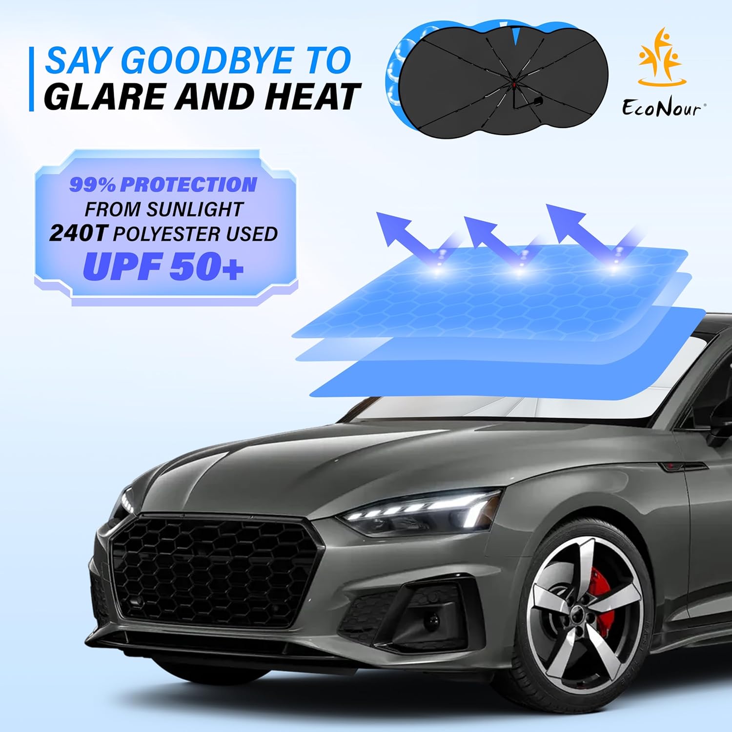 EcoNour Car Windshield Sunshade Umbrella | Foldable Windshield Sun Shade Cover | Front Car Window Shade for Maximum UV Rays & Heat Protection | 240T Polyester Umbrella Sunshade