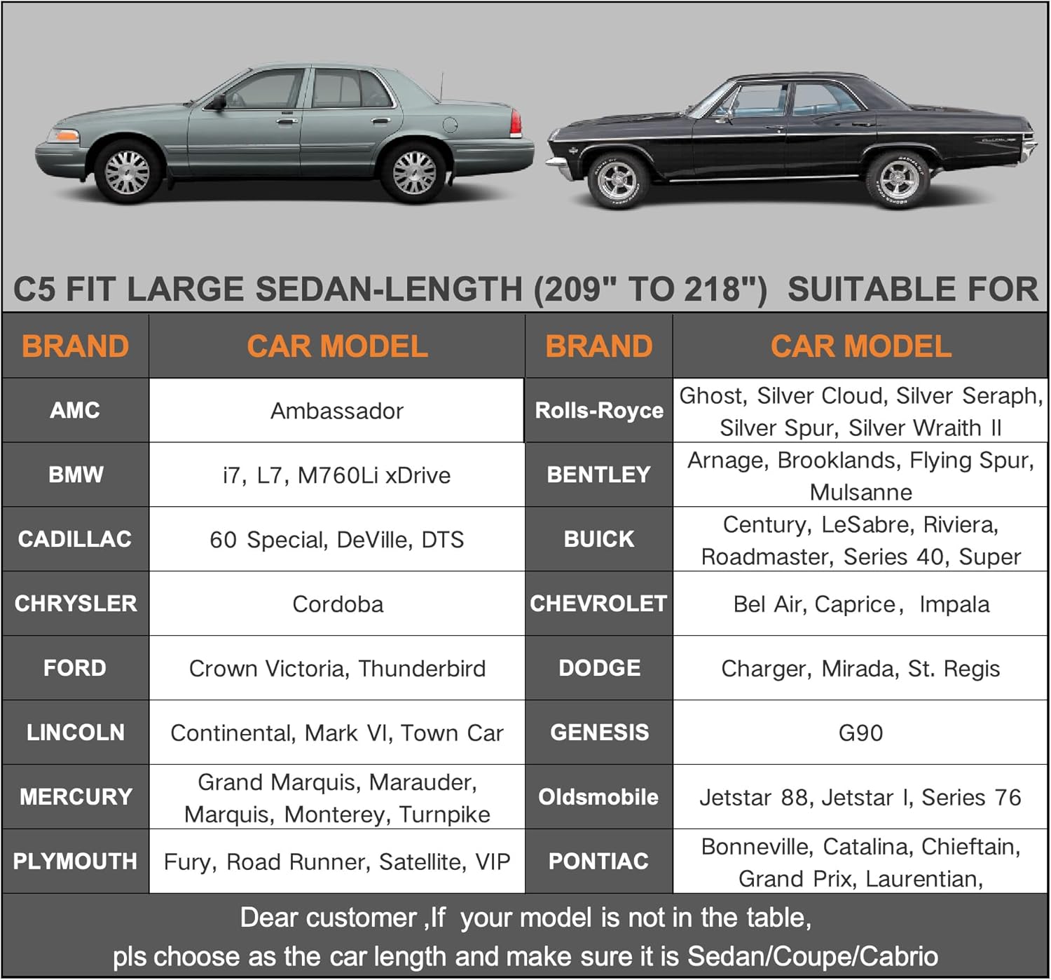 - ăDimension C5ăâ Universal fit for large sedan Coupe Sports Car which length is 209 to 218 inch. (NOT FOR HATCHBACK/SUV). Come with a large enough and waterproof portable storage pocket to store the cover.