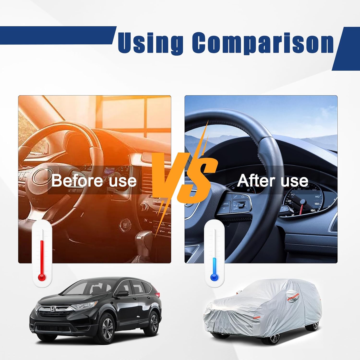- ăPremium Materială-Kayme 6 layers SUV car cover is made of heavy duty material. 1 PE&PEVA is 100% waterproof, It's great for rainproof snowproofing. 2 High reflective aluminum is good at sunproof and anti-uv, Keep the car cool in the summer. 3 Thicker and soft cotton will protect vehicle painting. Kayme multi-layer material is much thicker and more durable than other similar products.