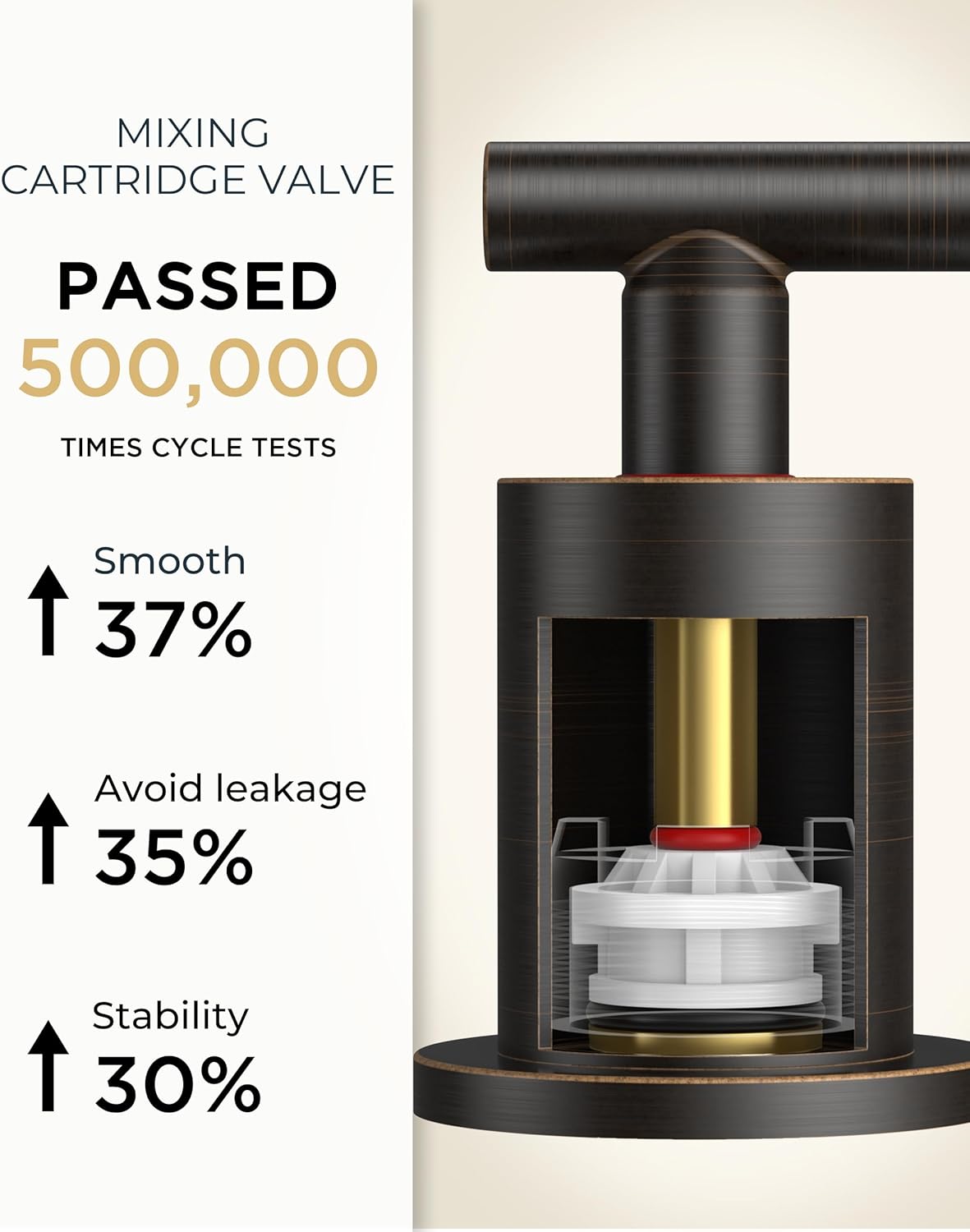 - STRONG HEART: Forious Drip-free copper&ceramic disc mixing cartridge has passed 500,000 cycles of water tightness test, to ensure that the faucet is stable. The Double-enhanced abrasion durability providing leak-free, trouble-free performance