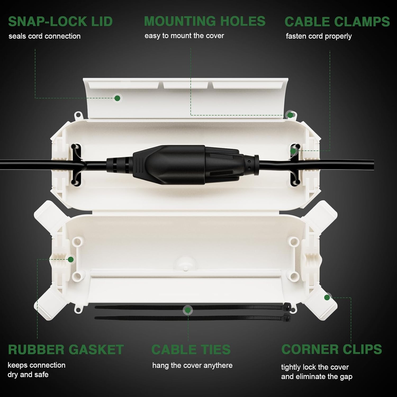 - Easy to use, place the connection into the safety seal enclosure and clip the cord with the clamps. To hang the cover, use the included cable ties and insert them to the side mounting holes.