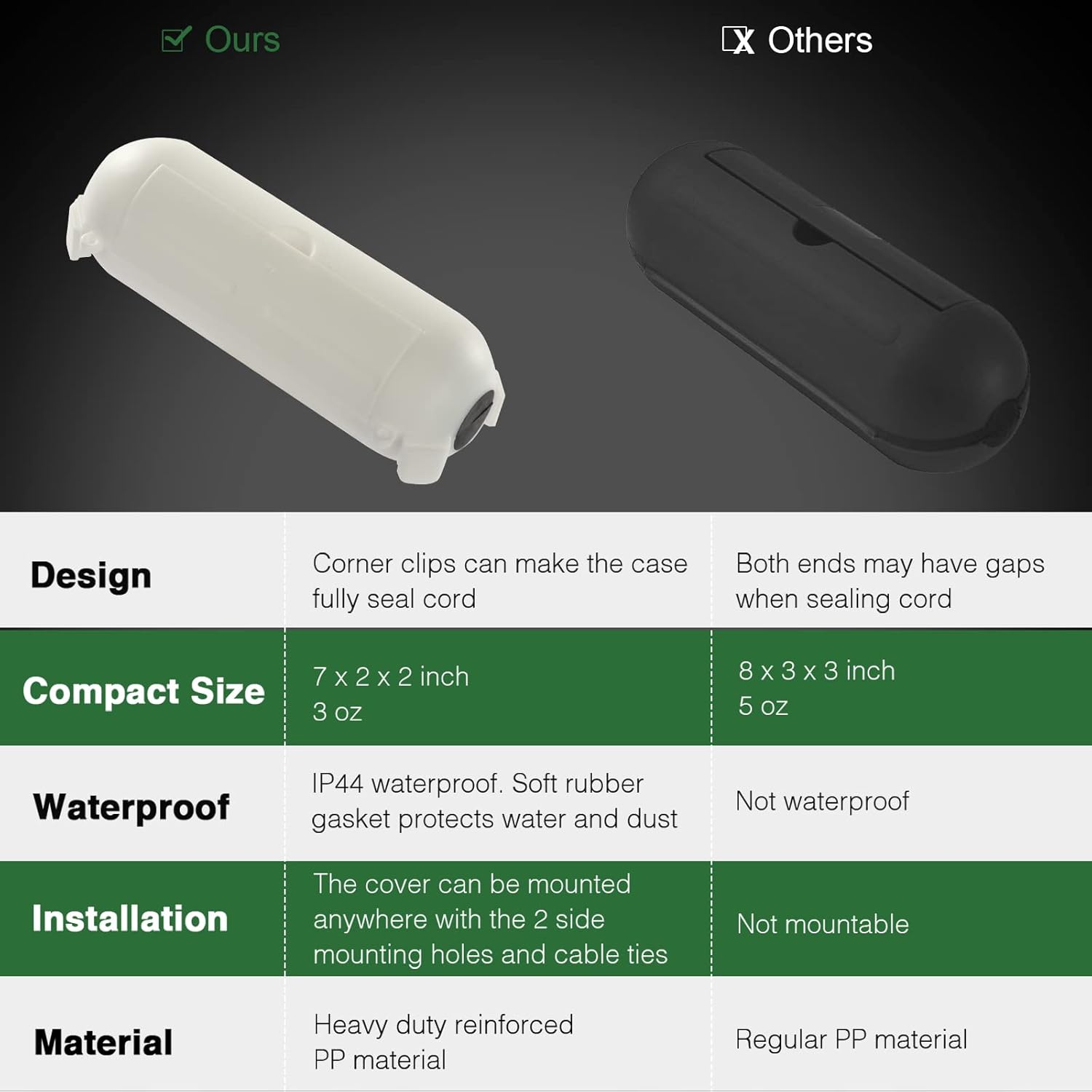 - Made with heavy-duty reinforced PP material to withstand rain, snow, water, dust, dirt and more, continuously protecting outdoor connections from electrical hazard.