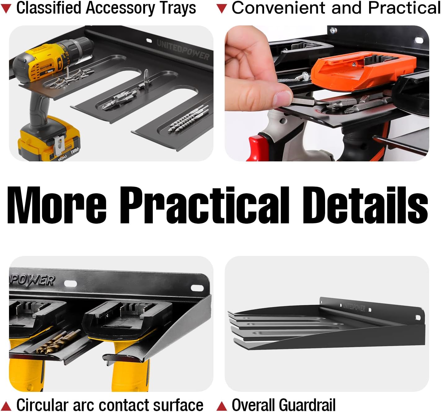 - Space Saver: Our power tool organizer wasted wall space into a compact & efficient power tool storage and display area. Three dishing trays on the rack for accessories, allowing screw driver, drill bits and bolts with in. Save more storage space for workshop, shed etc