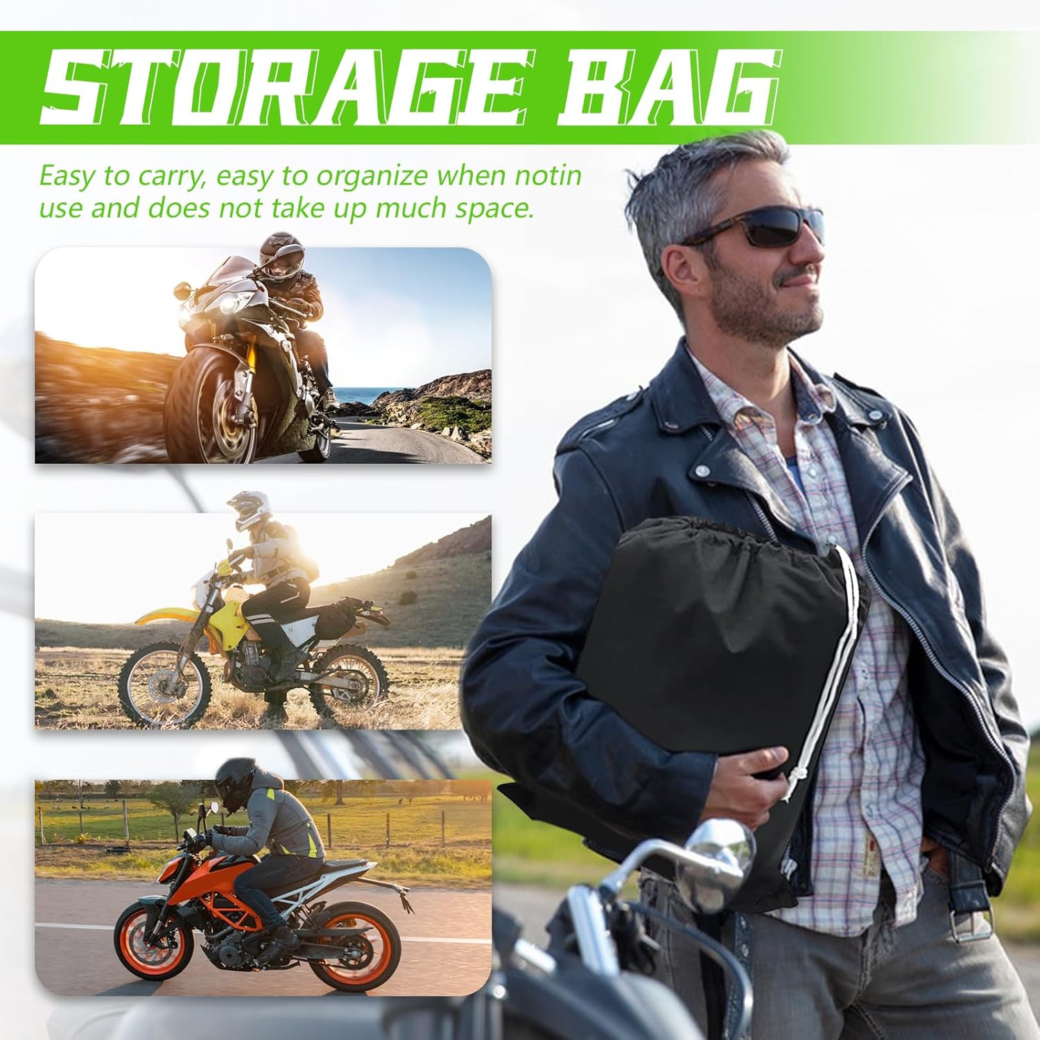 - Configuration: A motorbike cover, a black storage bag. Easy to carry, weatherproof and dustproof in all seasons, effectively protect your car and improve your driving experience.