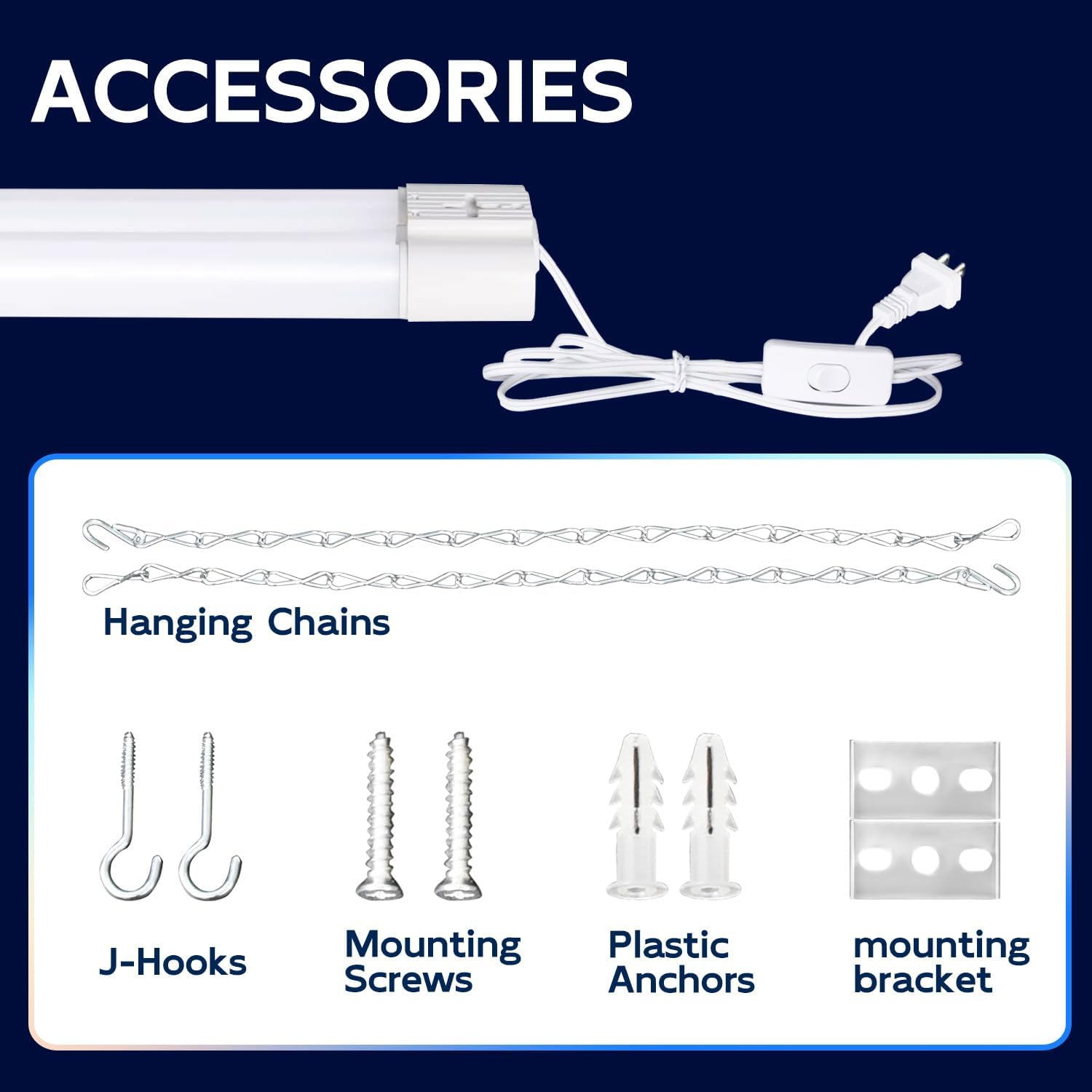 - ā Easy Installation - Plug & Play. Come with 59" power cord with on/off switch and other small accessories. You can hanging it with the included hanging chains or directly mounted to the ceiling with the included mounting screws.