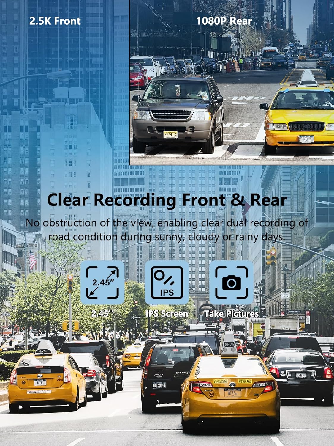 - 2.5K MINI DASH CAM FRONT AND REAR - βThe NEW VERSION has been updated since January 25, 2025. The resolution has been upgraded for a better experience. It comes with a 170 wide-angle 2.5K front camera and a 1080P HD waterproof rear camera that captures all three lanes of the road. This mini and compact dash cam won't obscure your view. Meanwhile, the IPS display and WDR function make video recording more vivid, colorful and clear.