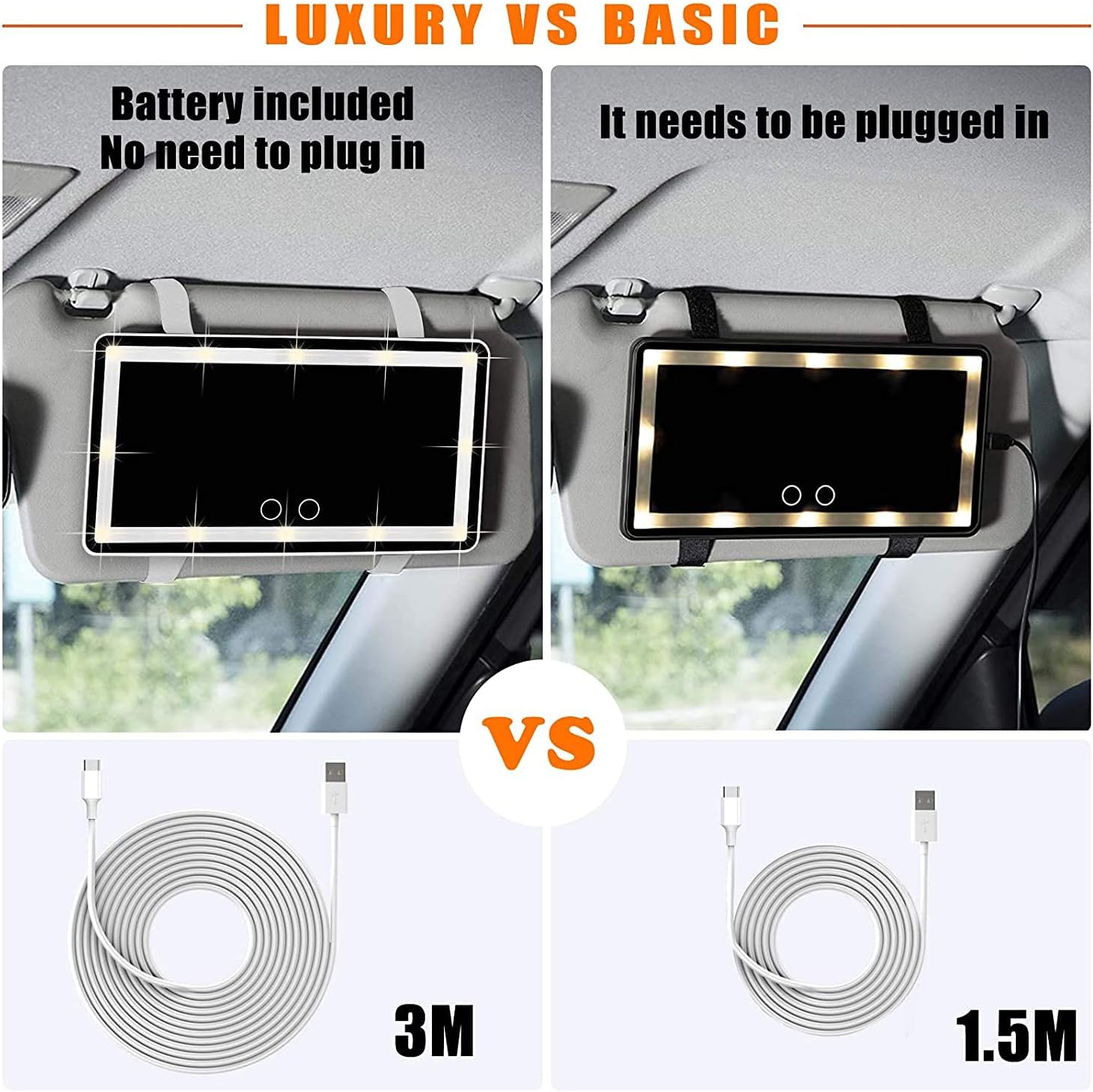 - 【LATEST UPGRADE】- This Car LED lights vanity mirror has been upgraded with a built-in lithium battery that can be charged and Car Vanity Mirror can be used without always plugging in the charging cable. The makeup mirror power cord has been extended and upgraded to 3meters. Don’t worry about the trouble caused by too short power cord.
