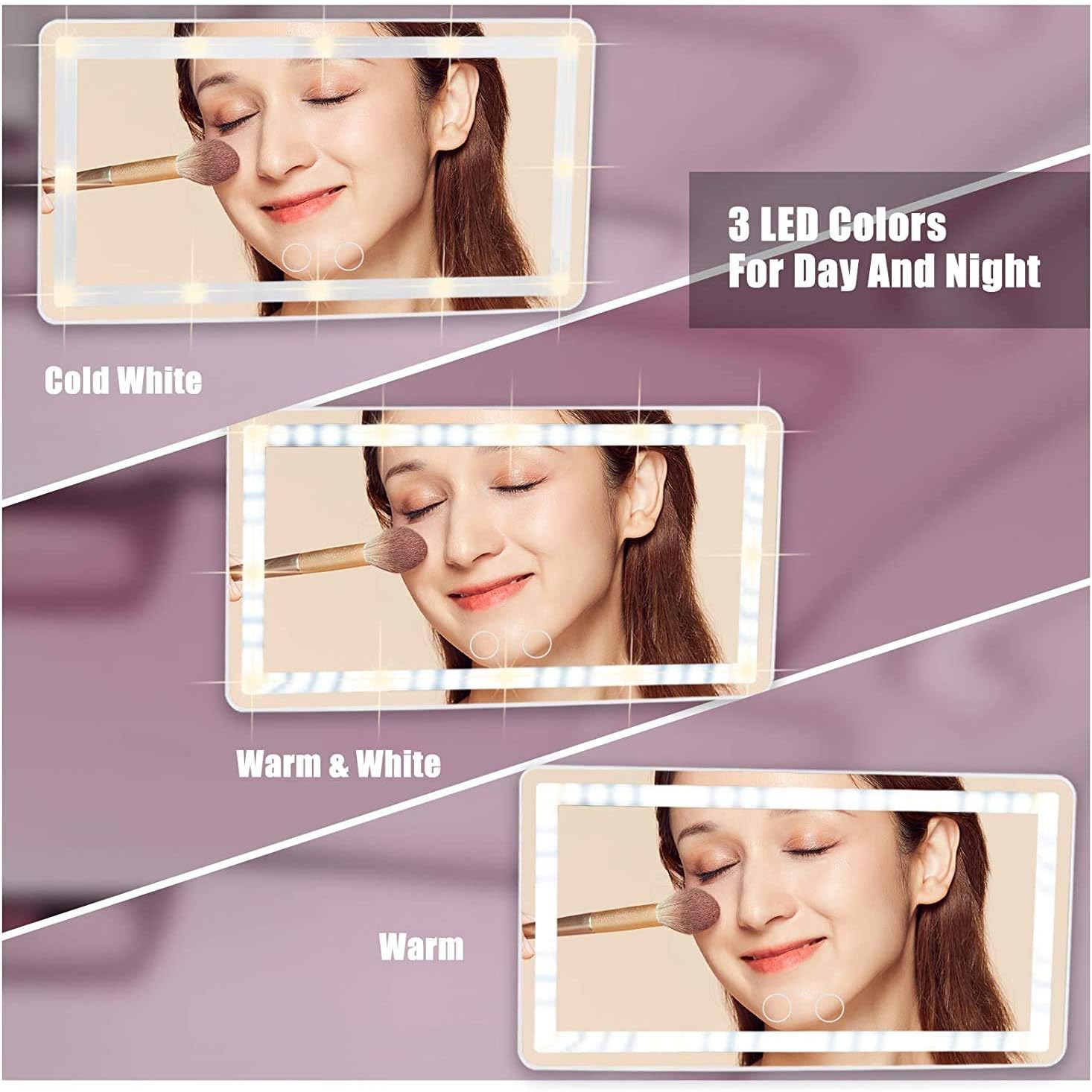 - 【DIMMABLE BICOLOR LED LIGHTS】-The car makeup mirror has 12 yellow lights and 48 white lights, which is 40% brighter and 60% less energy than normal bulbs. Short press the 2 sensor switches to replace 3 light colors: white, yellow, white and yellow. Long press for dimming according to what you need. 2500-6500K color temperature is equivalent to outdoor sunlight, the makeup is naturally no difference.