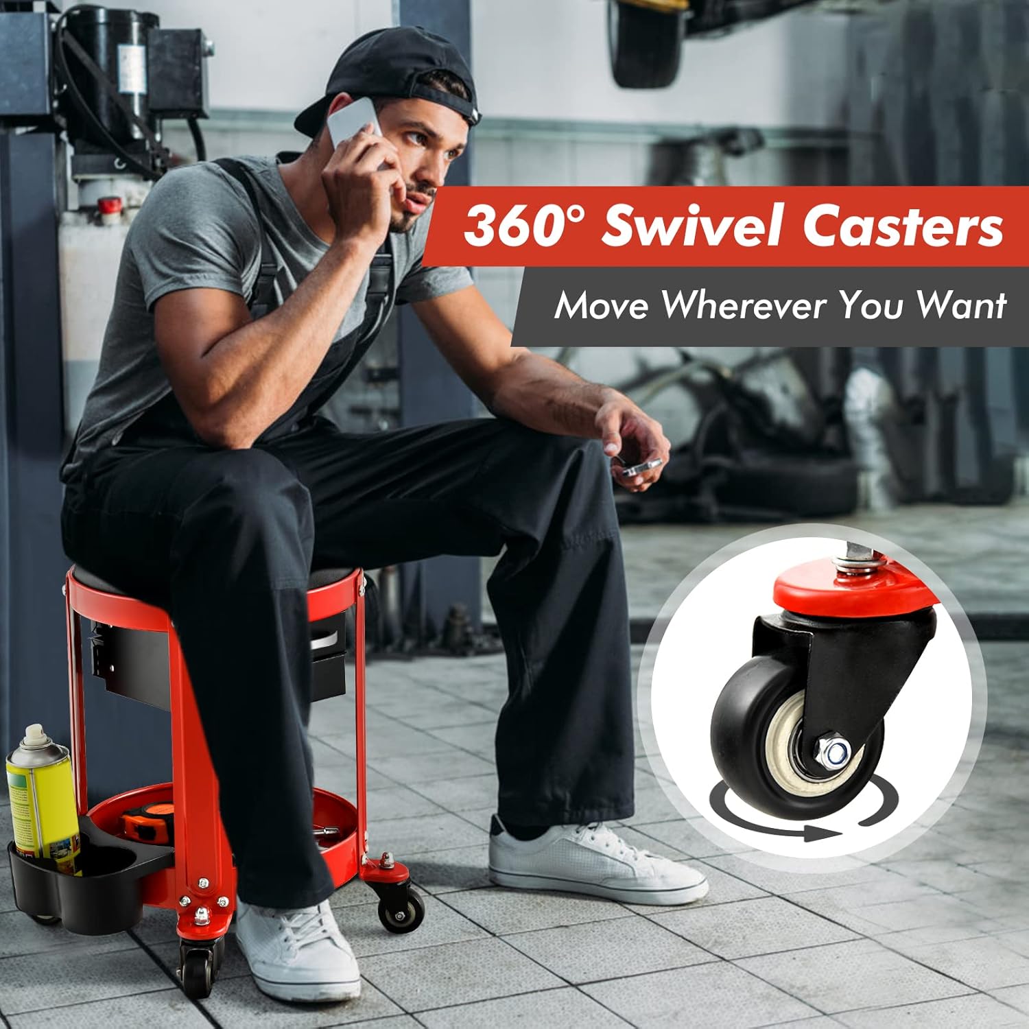 - 【Mechanic Stool with More Storage】This rolling mechanic stool includes 2 drawers in 2 directions, the twin can holders and a round tool tray, which provides you with large storage space to accommodate various tools and makes them within reach for convenient use.