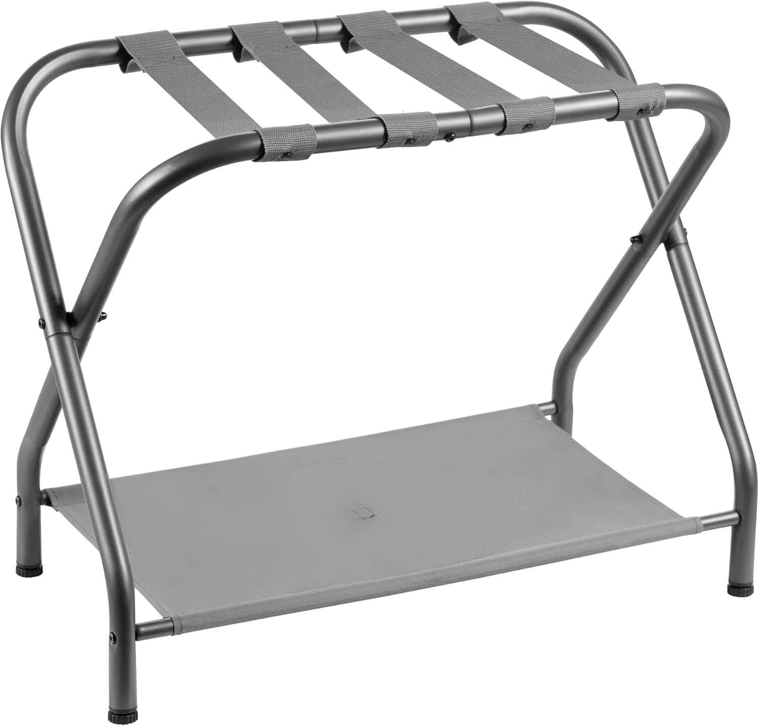 - Awesome addition for guest room: It was sturdy enough to hold a huge suitcase. Having the extra shelf allows storage for a tote bag or Shoes. The racks are very lightweight and fold up for easy, compact storage.