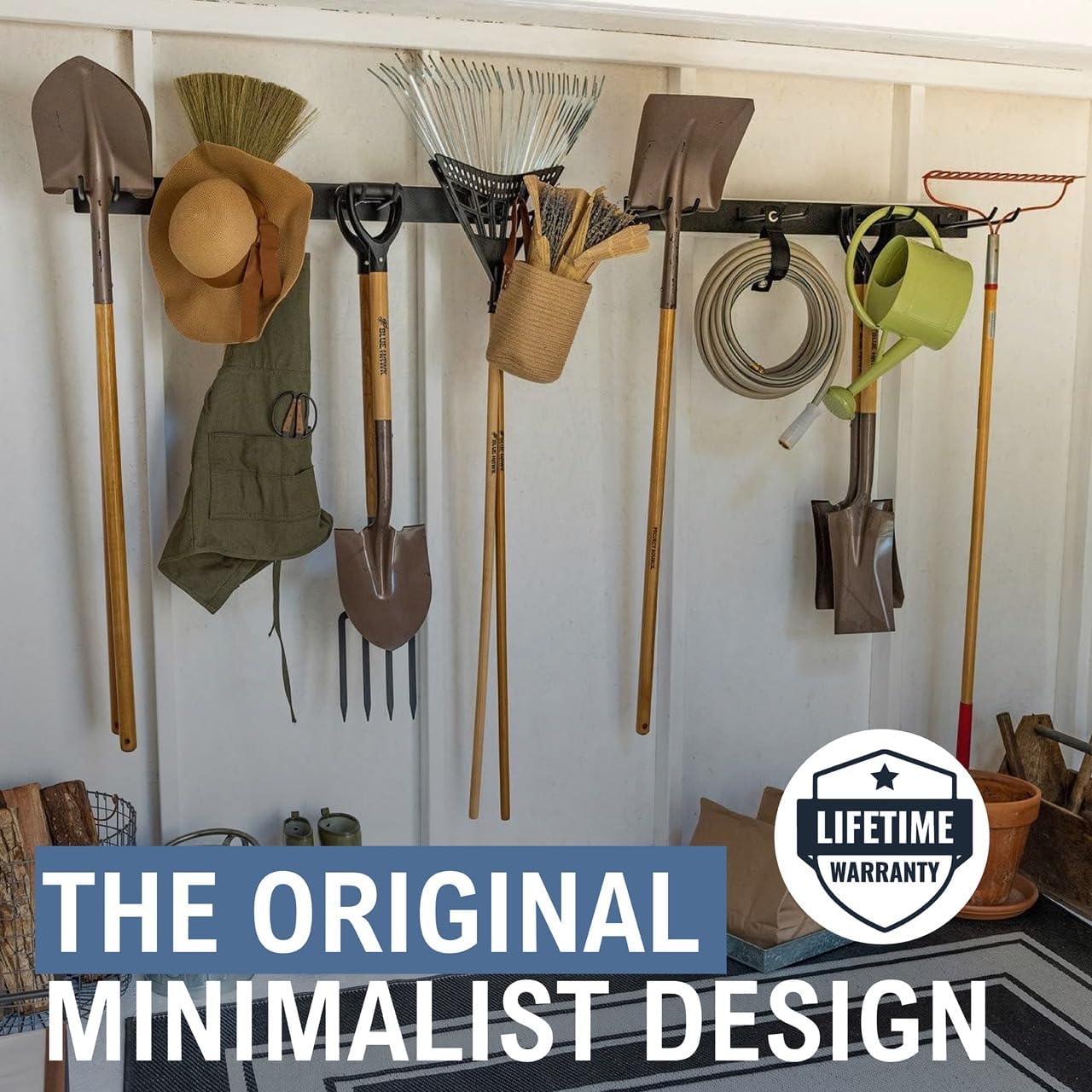 - RECLAIM YOUR GARAGE – Conquer clutter with this garden tool organizer designed for garage storage, sheds, or workshops. Measuring 36" L x 9.5" W x 2.5" H, it features four PVC-coated garage hooks and a 250 lb weight capacity, ideal for storing shovels, brooms, rakes, and power tools. Installs with 3 heavy-duty lag screws directly into 16" wall studs for secure, long-lasting support.