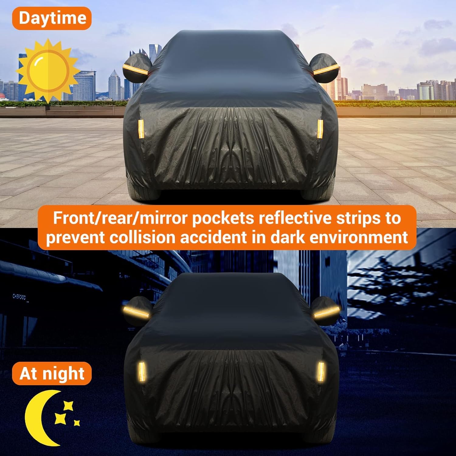 - Unique Design: DRIVER SIDE ZIPPER FOR EASY ACCESS. Front/rear adjustable windproof straps and buckles, the waterproof car cover with elastic hem can be firmly fixed on your car even in windy days. Cover with cable lock eyelets, free anti-theft lock for anti-theft protection. 6 reflective strips to protect your car for safe parking at night, 2 mirror bag. Double stitched full SUV cover for durability, abrasion and tear resistance.