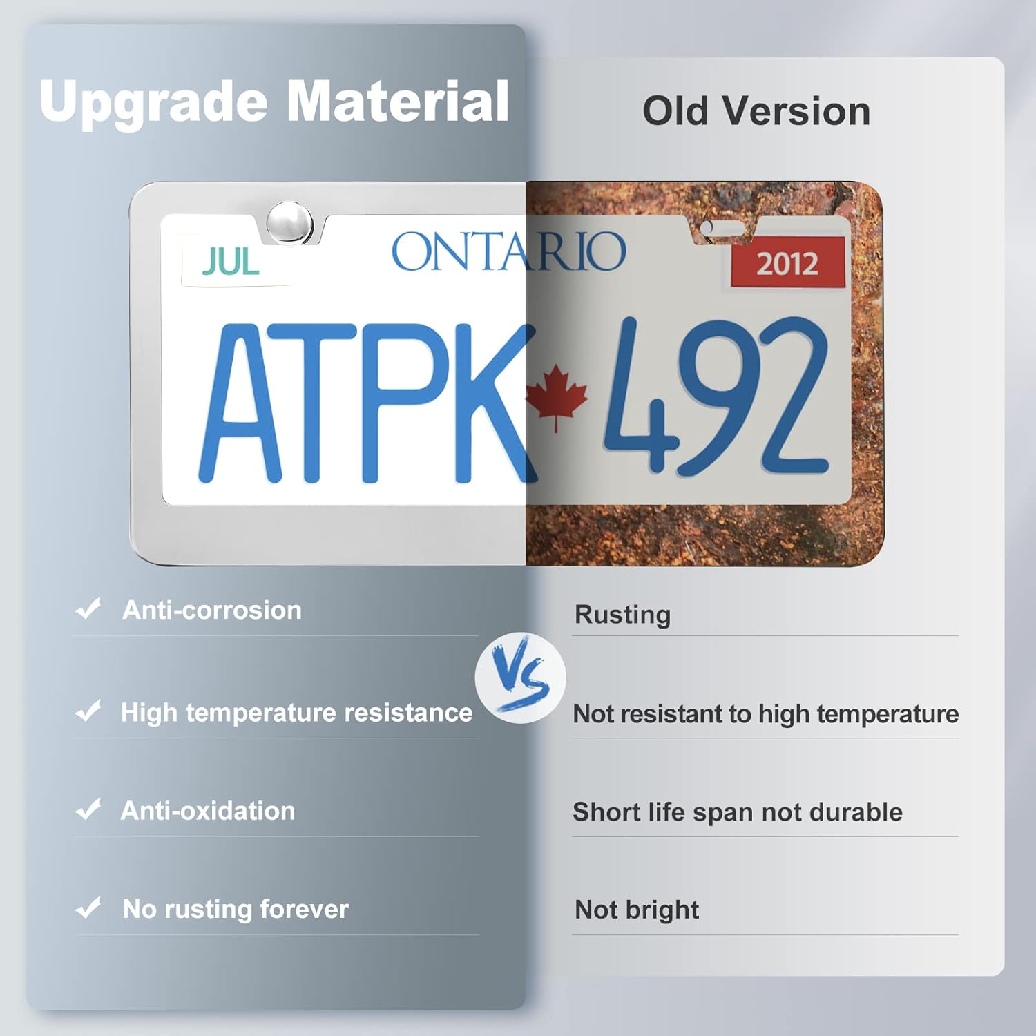 - STAINLESS STEEL LICENSE PLATE FRAME: The main characteristics are no rust, corrosion resistance, air and steam resistance. Wear-resistant, waterproof, not afraid of high temperature, easy to deal with all kinds of bad weather, avoid light pollution, easy to maintain.