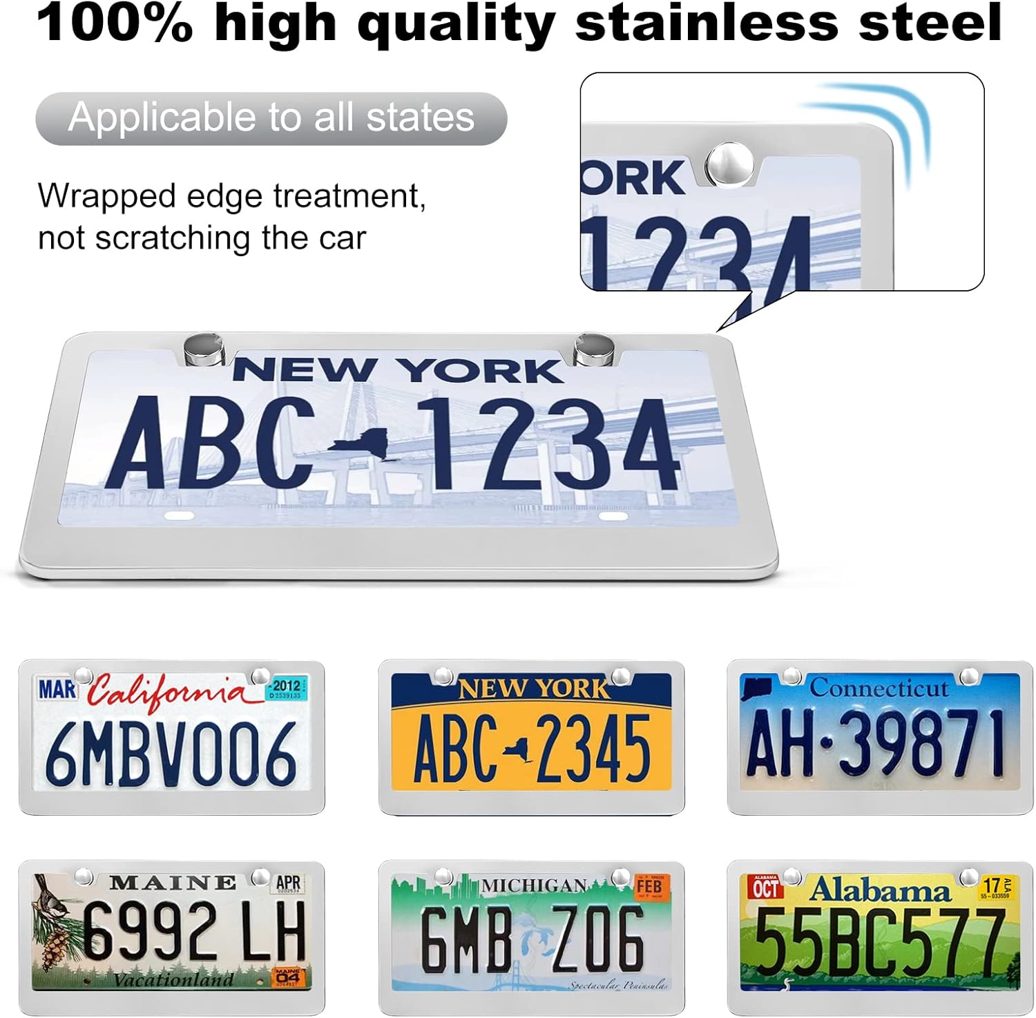 - THE NEW STYLE DOES NOT COVER THE STATE NAME: The upgraded style of the license plate frame is more suitable, and the size of 12.2inch*6.3inch meets the US and Canada standards. The license plate frame is covered with arcs, and the corners are finely polished to prevent scratches on the car paint and protect the license plate from warping and bending.