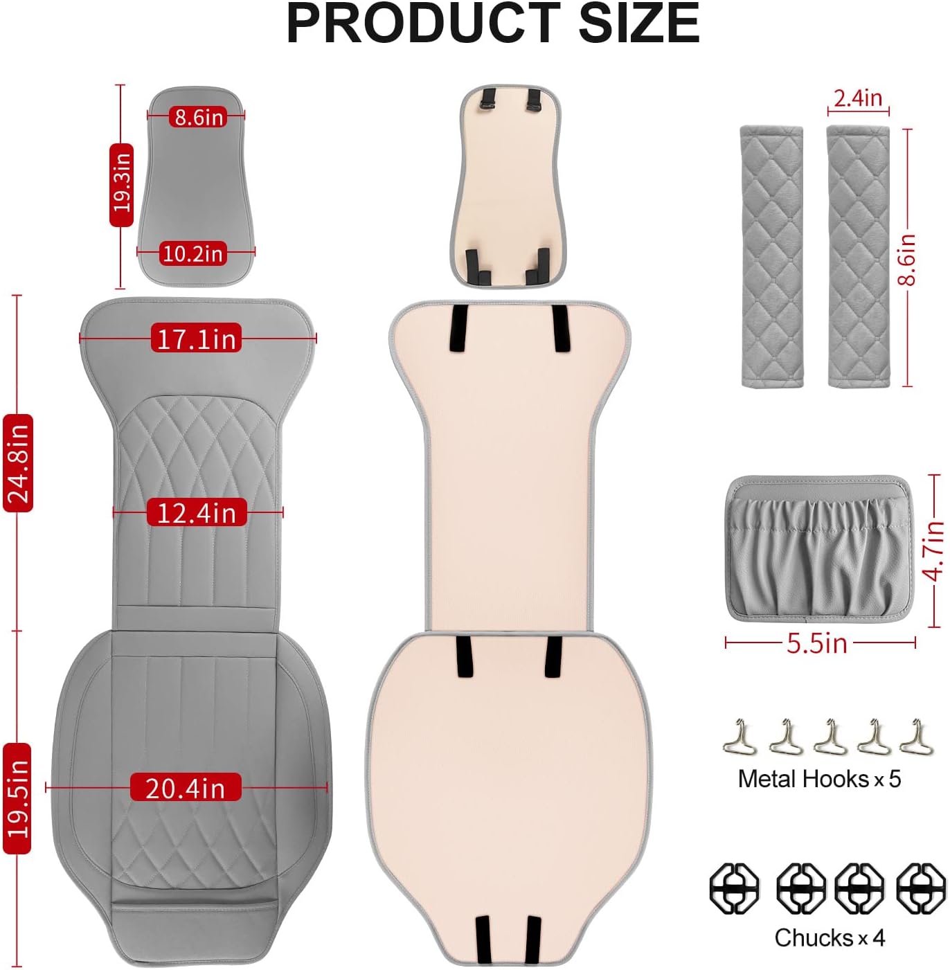 - Package Includes:car seat cover*2, car pocket organizer*1οΌcar seat belt pad*2,metal hook*5, chuck*4,installation manual*1.Please contact us if you have any questions about the product, and we will reply you within 24 hours.