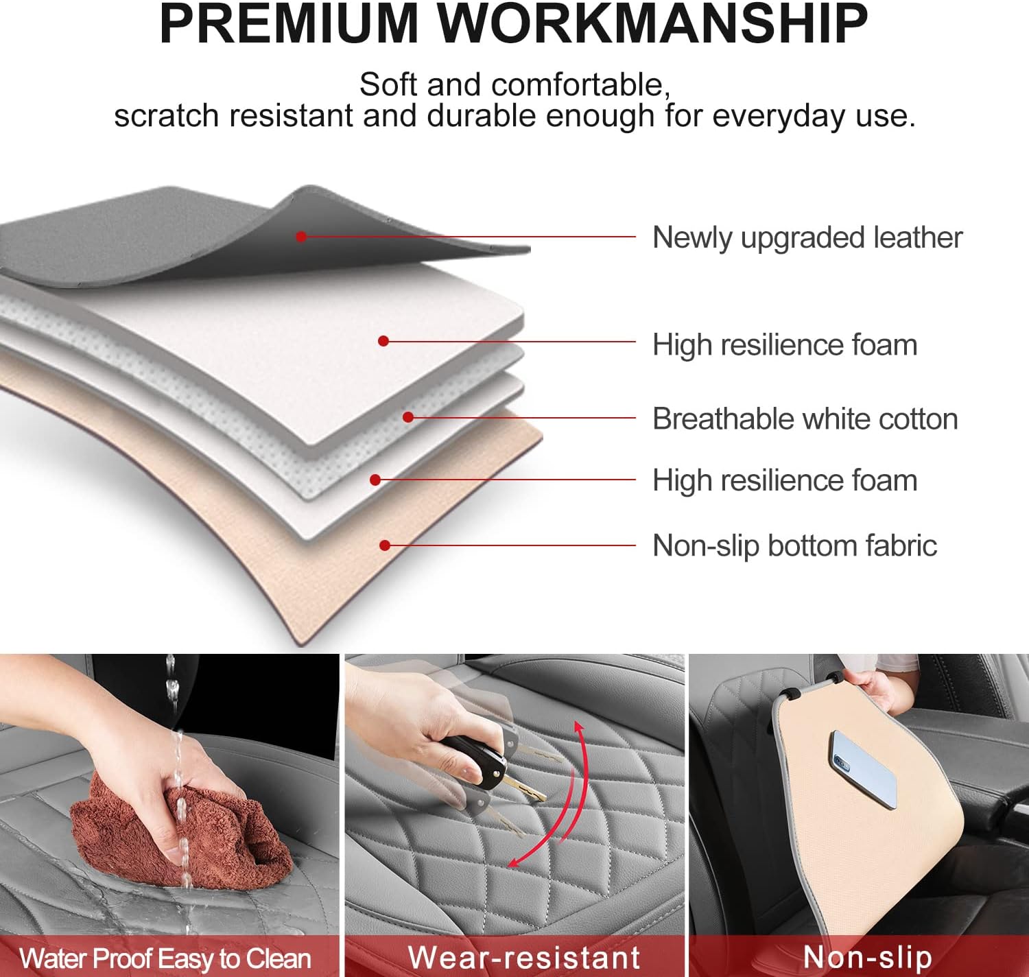 - Leather Soft & Comfortable: The PU leather front seat covers are wear-resistant, scratch-resistant, waterproof, and easy to clean. Rebound composite material is soft in touch, creating top resilience for maximum comfort during your drive. The non-slip backing ensures that the front seat covers stay in place. It's easy to care for and clean with a wet soft towel.