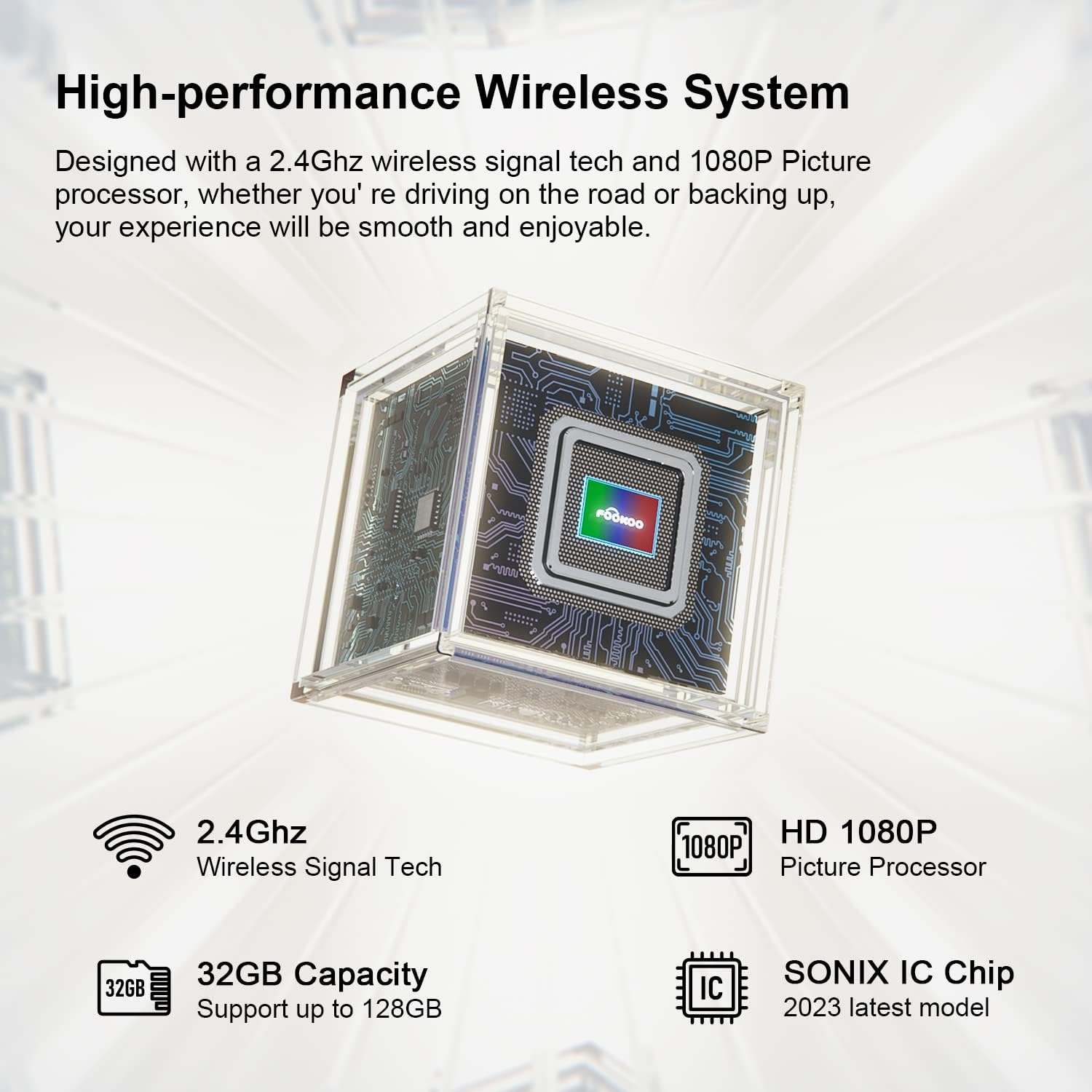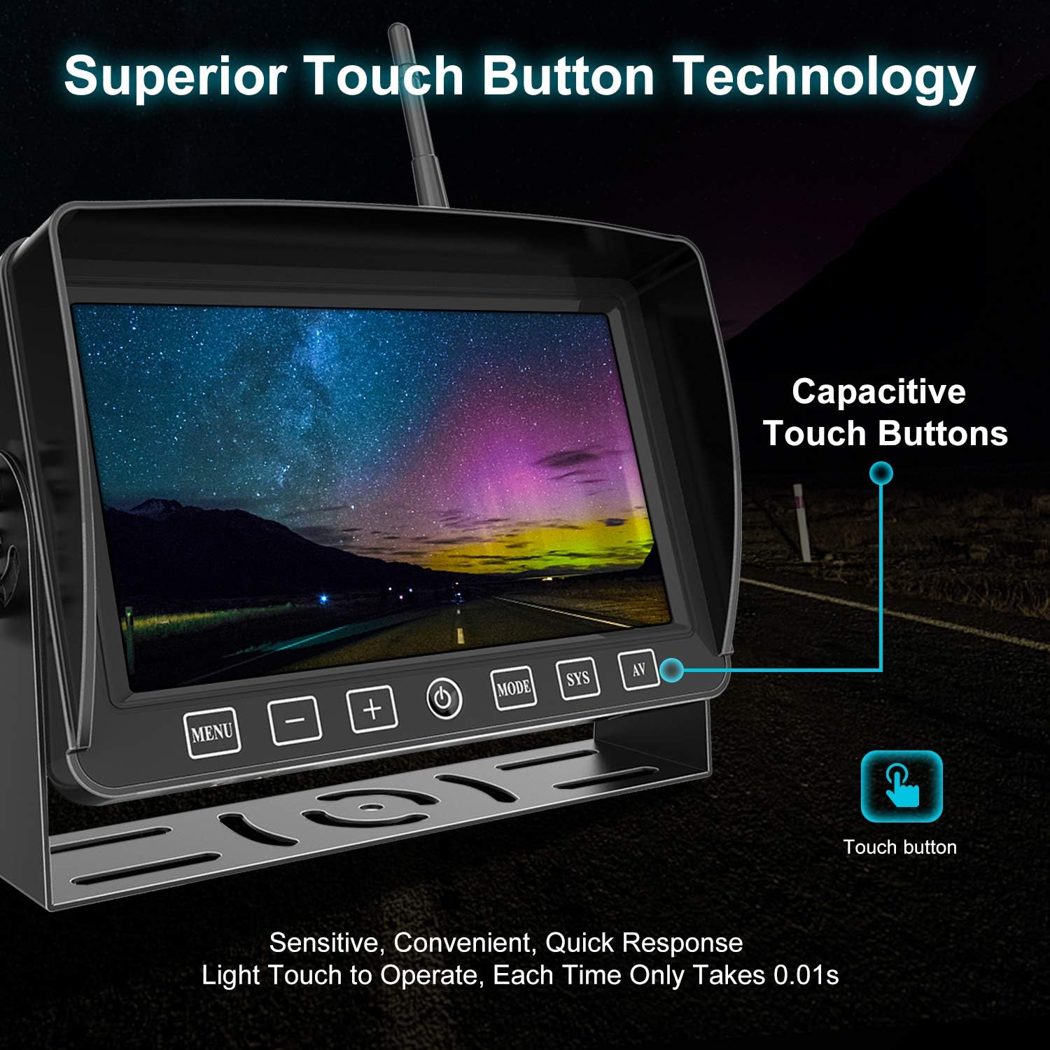 - ā Advanced Capacitive Touch Buttons & Digital Signal: Touch buttons are more sensitive and convenient than traditional buttons. Gently touch-operated, its quick response makes it safer for you to use while driving. The wireless digital signal transmission reaches up to 108 feet in the open area, giving you a steady and real-time picture that stays steady and lag-free even when the car is traveling at speeds up to 95 MPH.