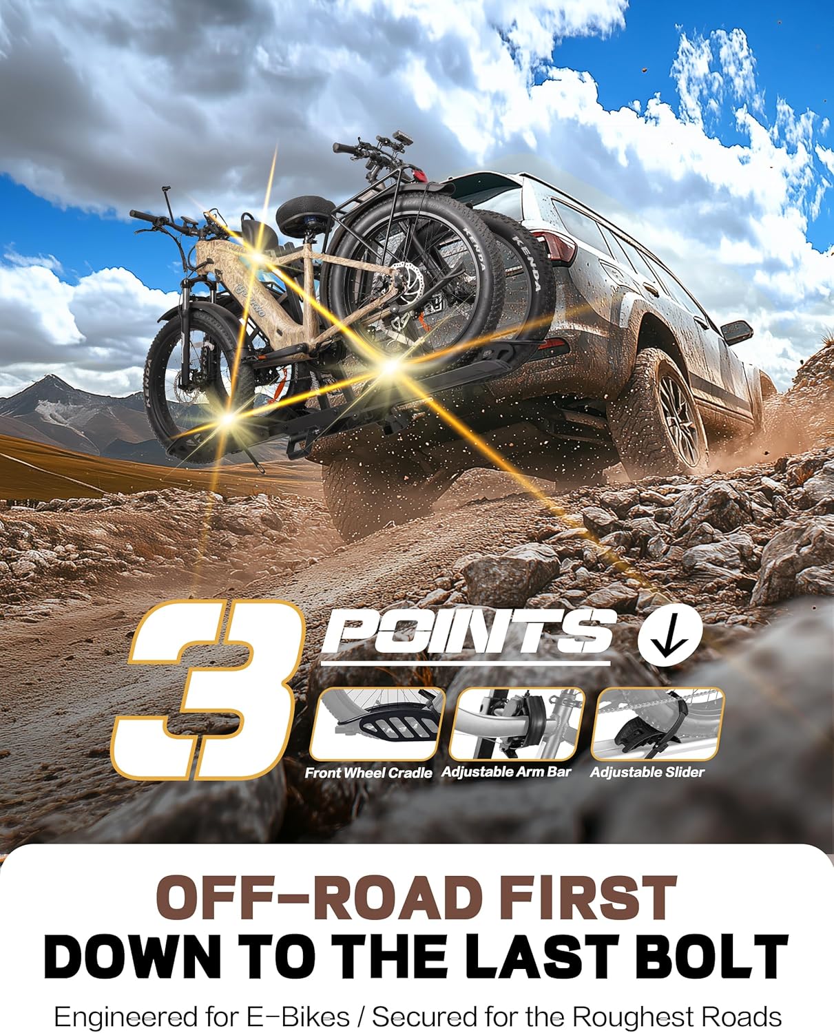 - SAFE AND SECURE ON OFFROAD: Comes with 2-arm fix, Anti-falloff 360° swirl structure, patent secure wheel cradles and anti-wobble structure, that secure your E-bikes in place without swaying and knocking against vehicle.