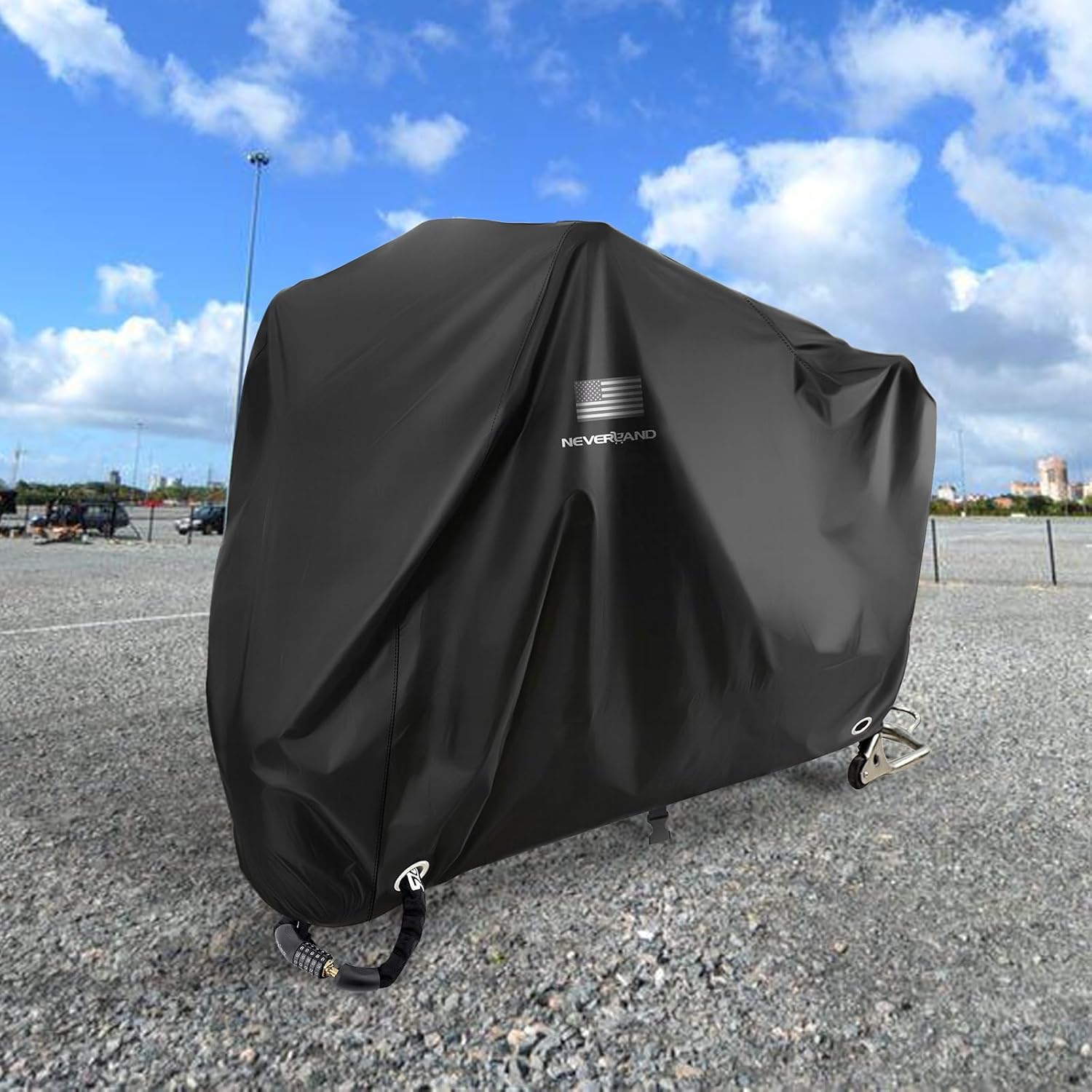 NEVERLAND Motorcycle Cover Waterproof Outdoor - Black Heavy Duty Scooter Cover, Motorbike Cover with Refletive Logo, Lock-Hole, Bandage, Storage Bag-Protect Against Dust, Debris, Rain and Weather(XXL)